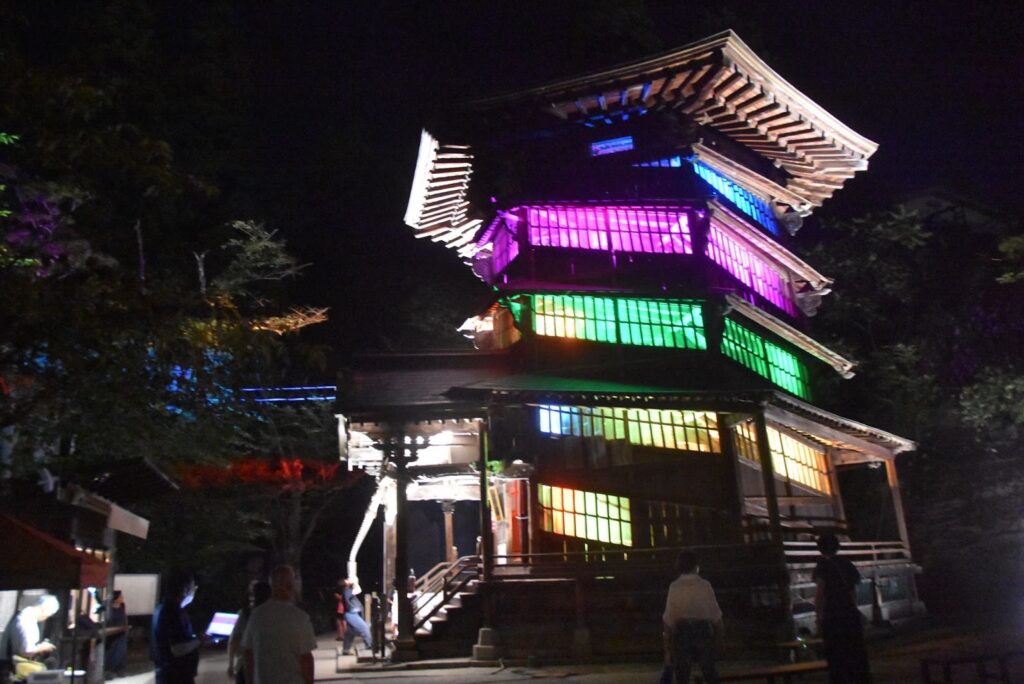 鎮魂祭の目玉のひとつは、さざえ堂のライトアップだ。午後8時まで続いた照明演出は、建築の構造美を際立たせるよう設計。実行委員会のひとりで、アートディレクターの佐瀬勉(さぜ・つとむ)さんは「内部からのLED照明に加え、外部からも建物の輪郭が分かるよう工夫した」と語る。赤、青、紫、緑、ピンクと色彩が変化する光が、さざえ堂を普段とは異なる空間へと変貌(へんぼう)させた。螺旋に沿って動く光の筋が堂内の木組みを浮かび上がらせ、まるで建物が呼吸しているかのような幻想的な雰囲気を醸し出した。建築・光・音の三要素が調和することで、さざえ堂は単なる建物ではなく、過去と現在が交錯する「体験の場」として昇華されたのだ。