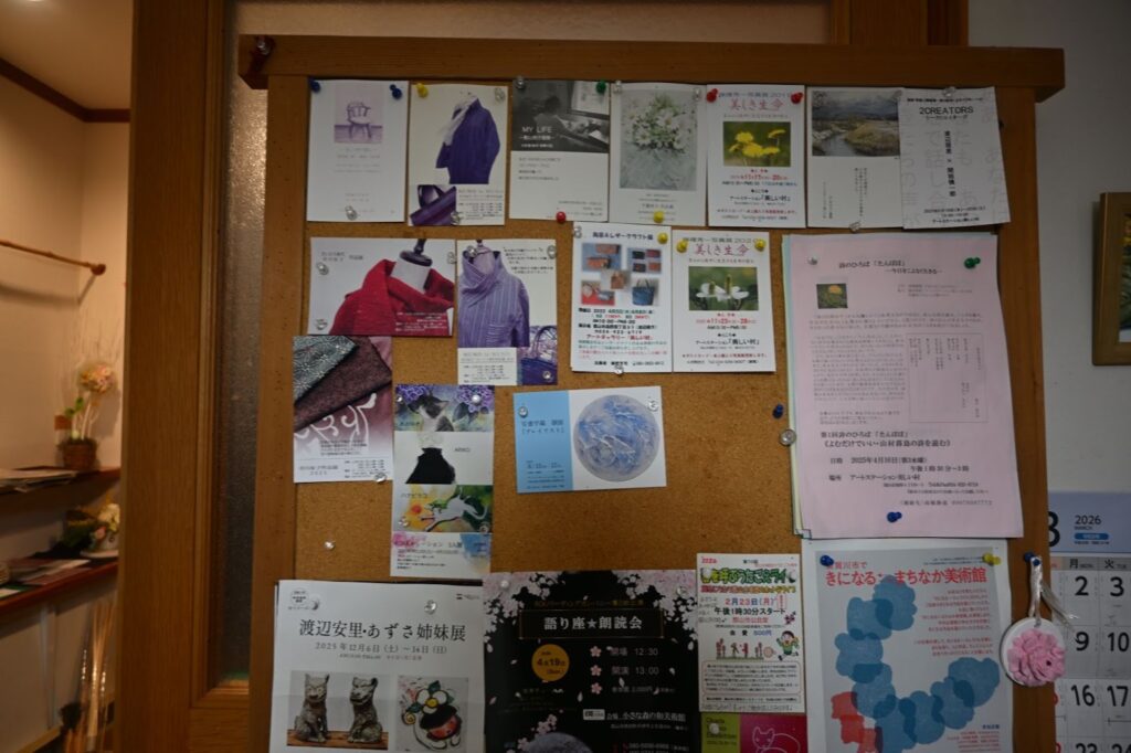 案内板にぎっしり貼られたDMの数々。開設当初からしばらくは、ほぼ毎月のように展示が行われていたという=2026年3月18日、福島県郡山市桑野、筆者撮影