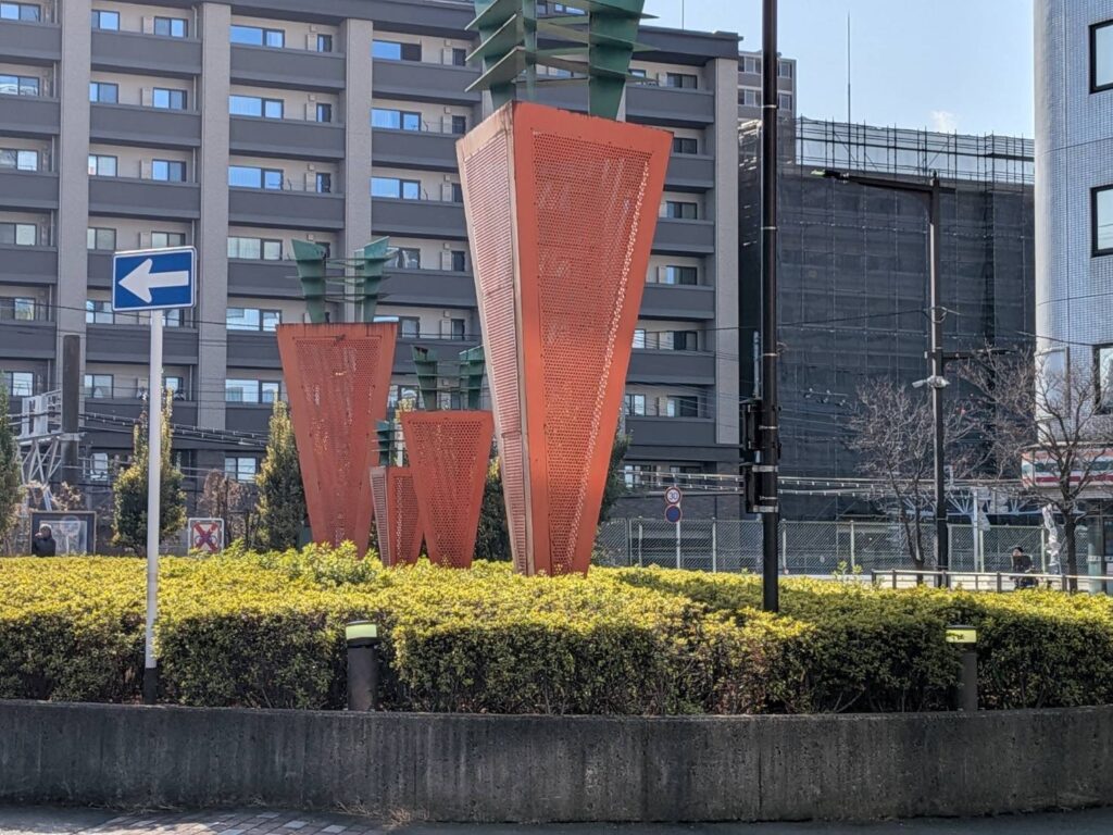 埼玉県朝霞市。JR東日本、武蔵野(むさしの)線が発着する『北朝霞駅』から、30歩ほど向かうと、『北朝霞駅前 にんじんモニュメント』が目の前に広がっています。4本立ち並ぶモニュメント。