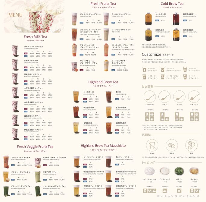 サイズはS・M・L・LLから選べる。甘さ、氷の量、追加のトッピングもカスタムできるので、自分好みの味を見つけてみてください。