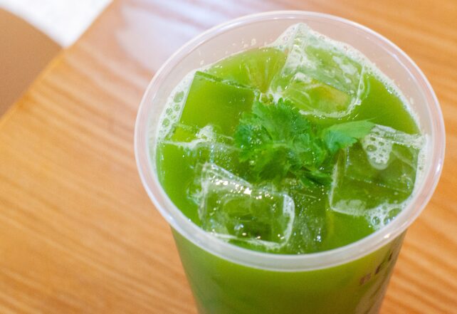 メニューを見ていて、「パクチー」の文字に目が釘付け! パクチーのドリンクって一体どんな感じ?! 「飲んでみますか?」と言っていただいたので、「ビターメロンコリアンダーティー」も試飲させていただきました。ビターメロンというのはゴーヤのことです。ジャスミンティーにゴーヤ、青リンゴ、ケール、パクチー(コリアンダー)をミックスしたドリンクです。ケールは青汁の材料ですね。