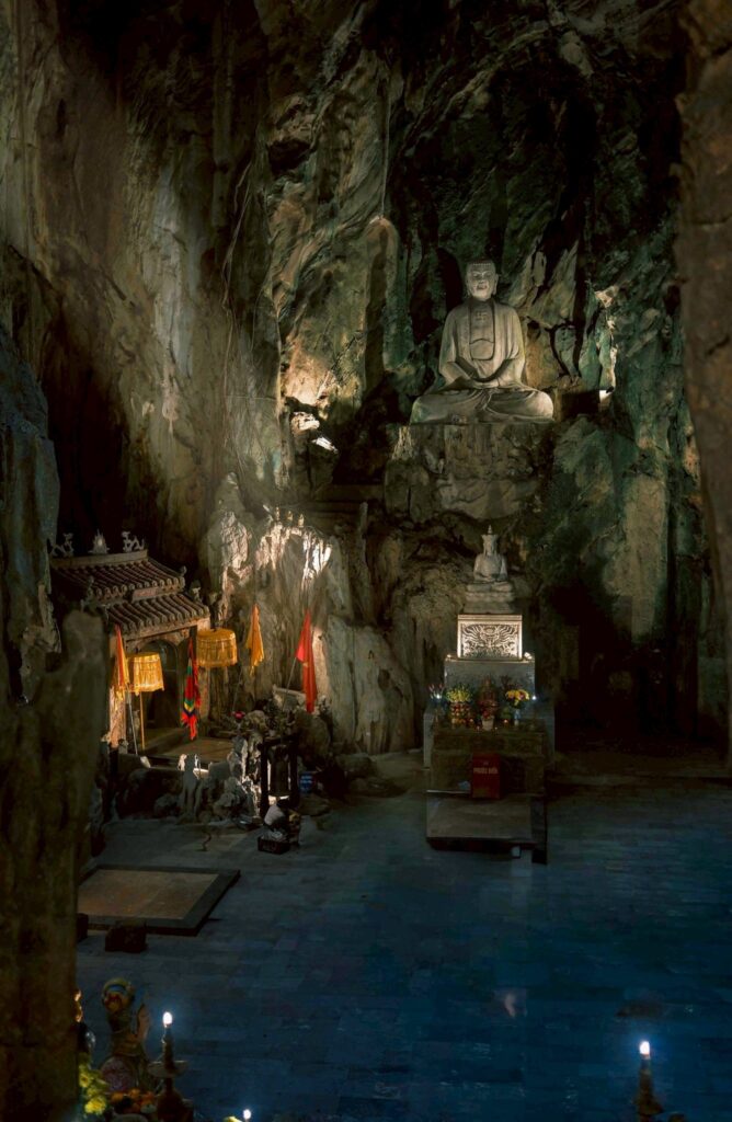 岩肌に囲まれた空間に、天井から差し込む光。静かにたたずむ仏像。フィエンコ洞窟(写真)は、五行山の中で最も天井が高い洞窟。ベトナム戦争時の空爆によってできた天井の穴から差し込む光が、幻想的な空間を作り出している。