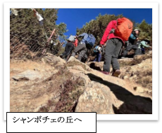 ロッジの裏手からシャンボチェの丘まで2時間の急登です。かなりハードですが、コンデリ(6187メートル)などの山々が優美な姿を見せ、圧倒されながらでも辛さも吹き飛びました。