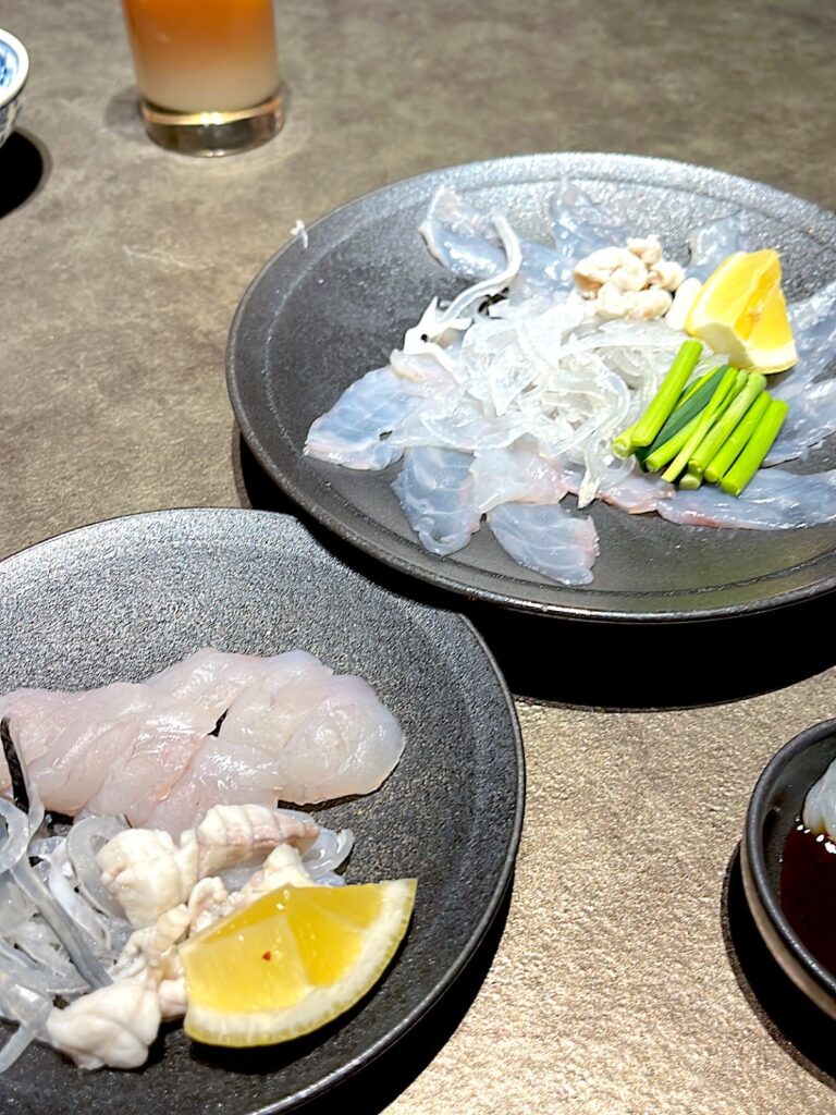 まず目を奪うのは、まるで花びらのように並んだ「ふぐ刺し」。透き通るような白身に、包丁の音すら感じるほどの精緻(せいち)な技が宿る。