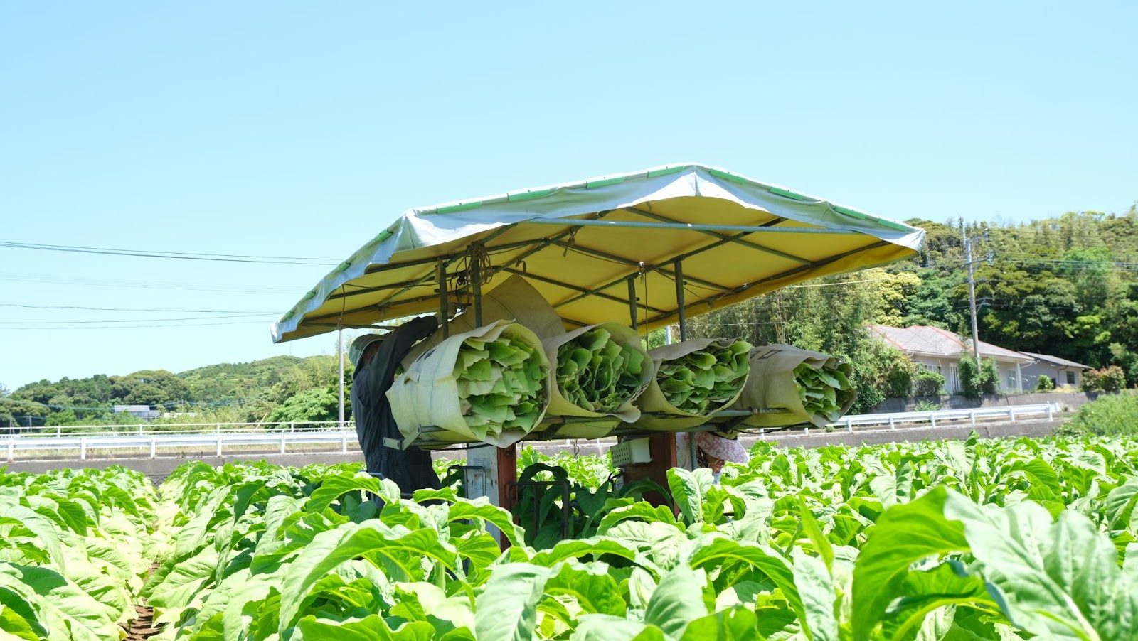 葉タバコ収穫、進む。葉タバコ作業車「AP-1」に乗って、刈り取る黄緑色の葉っぱ【長崎県壱岐市】 – スライドショー