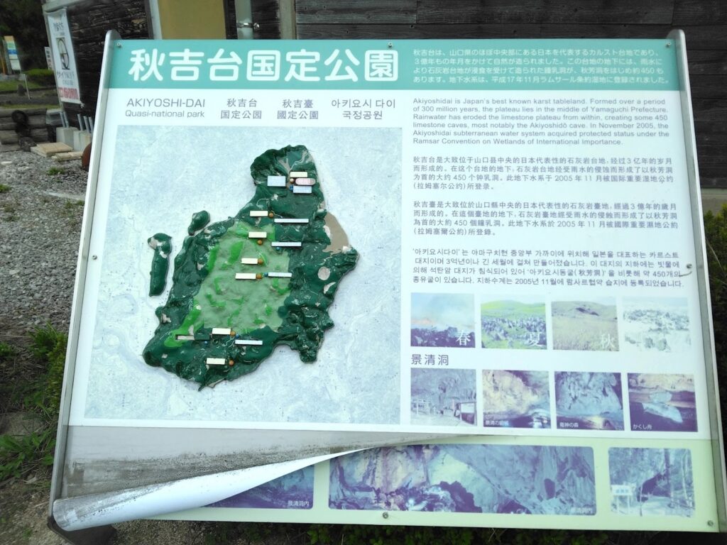 景清洞は秋吉台国定公園の中にある。日本を代表するカルスト台地で、3億年もの年月をかけて自然が造り出した。ここ景清洞のほかにも、秋芳洞(あきよしどう)・大正洞(たいしょうどう)があるので、時間があれば一緒に回ってみるのも面白い。