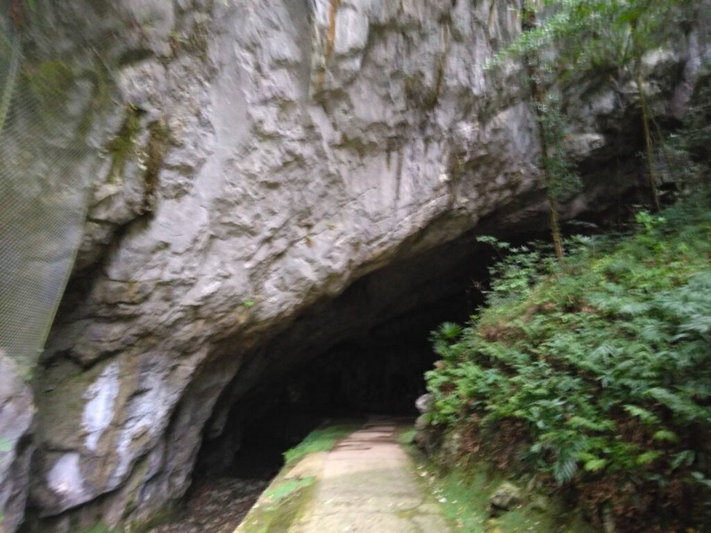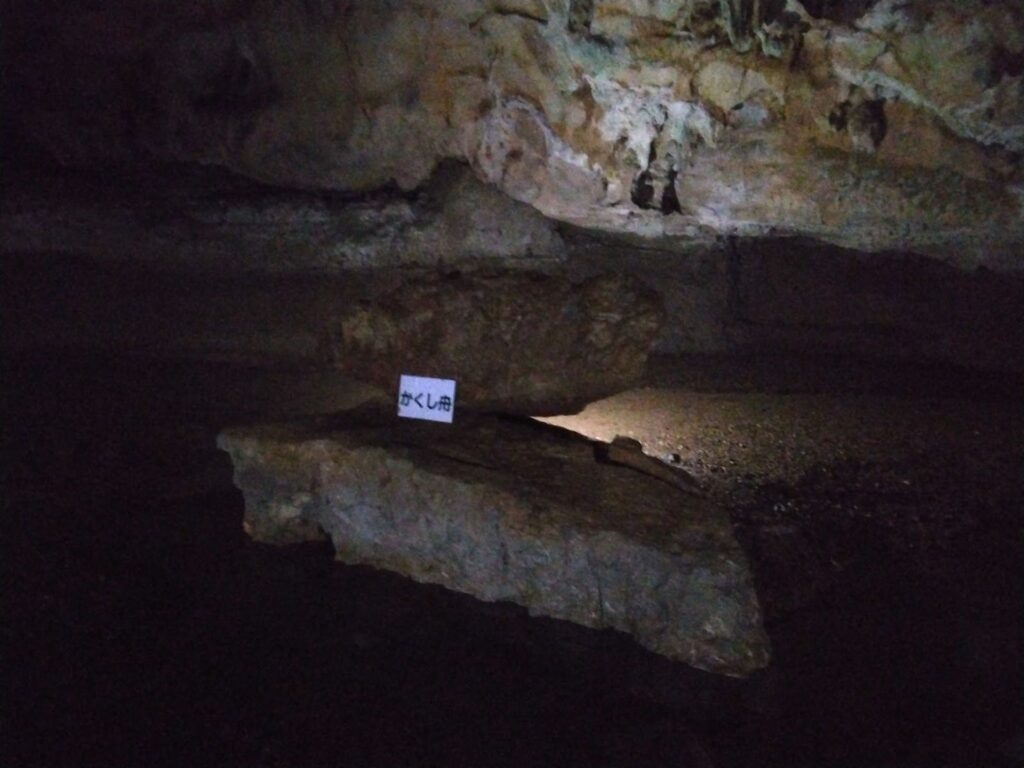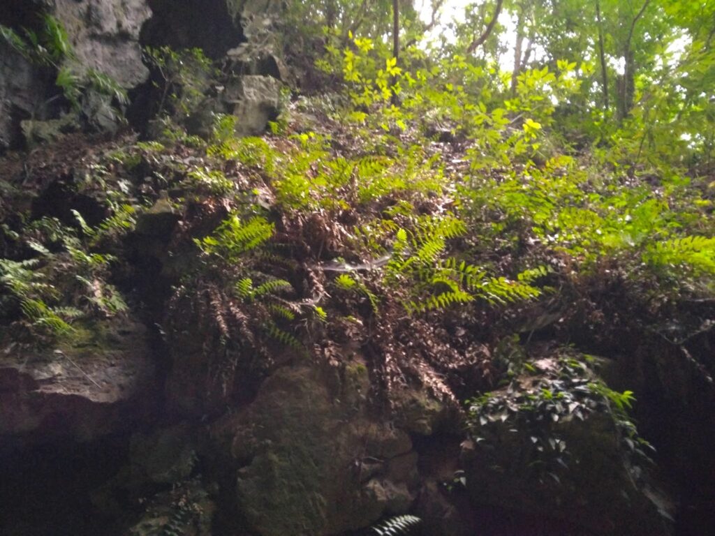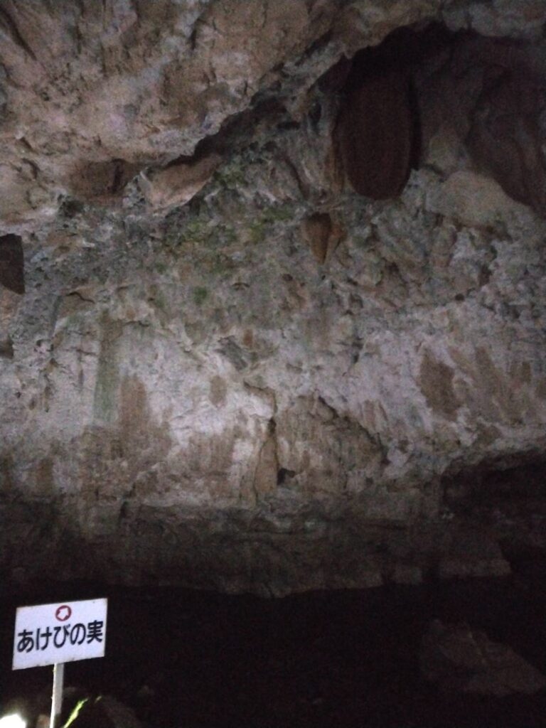 国指定天然記念物の景清穴。洞内では化石も発見できるかもしれない。サンゴや海百合などがあったということは、何かしらの地殻変動でせりあがってきたのだろうか。
