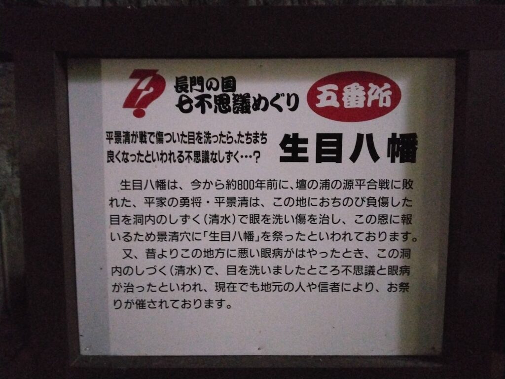 平景清(大庭景清)は、源頼朝暗殺をもくろむも失敗に終わった。彼は悪七兵衛と呼ばれており、この「悪」は勇猛という意味合いも持つ、平家方の勇将だった。壇ノ浦の戦いに敗れた後、この洞窟で負傷した目を洞内のしずくで洗うと、傷が治ったという。この恩に報いるため「生目八幡」を祭ったといわれている。
