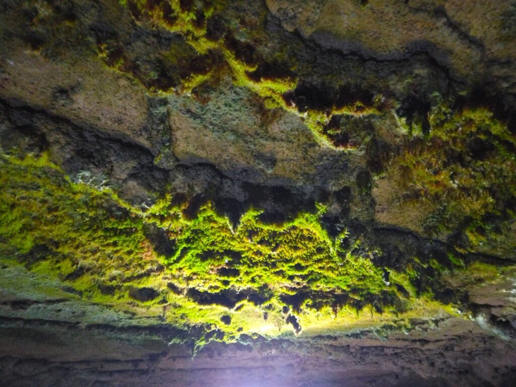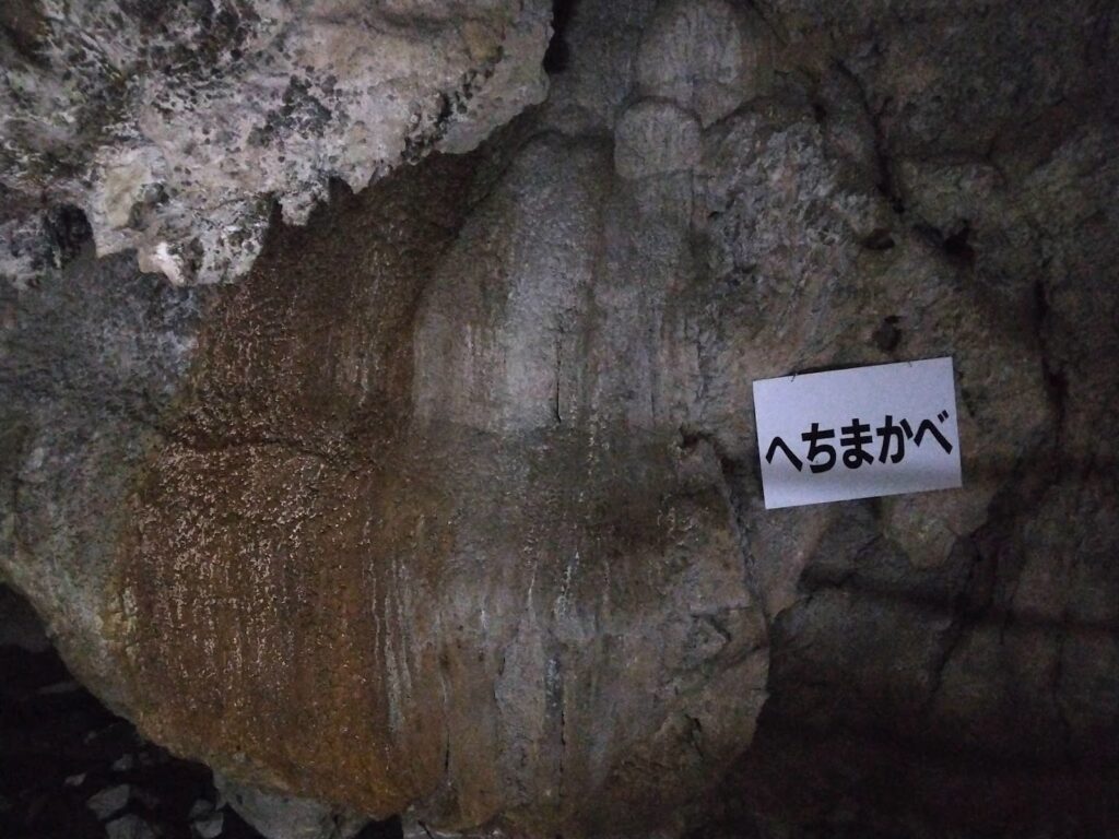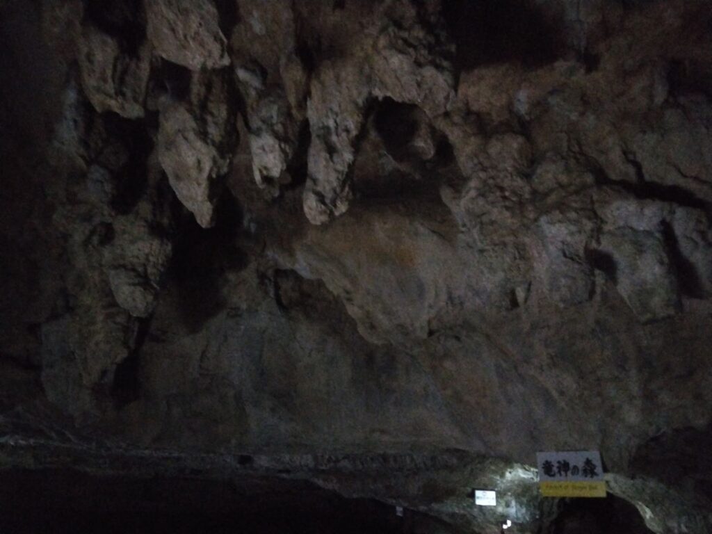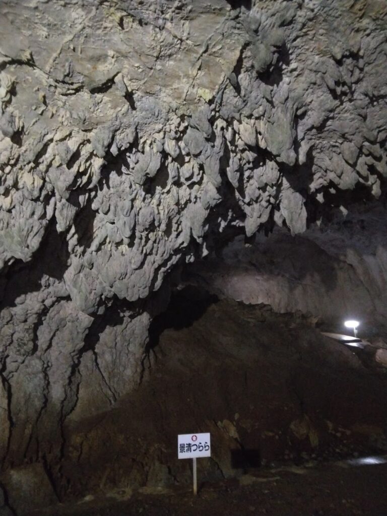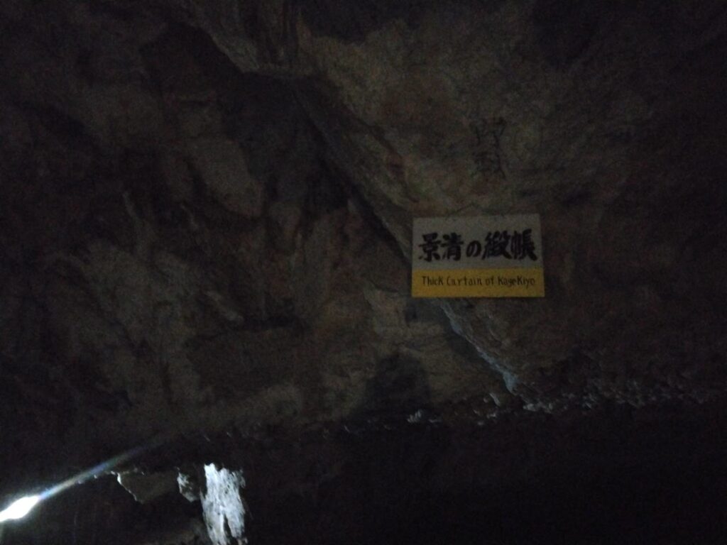 上を見上げると、「景清つらら」と呼ばれる光景が広がる。所々にへこみがあるので、黒い何かがひそんでいる。これはコウモリだった。キイキイと鳴いていたり、飛んでいたりする。