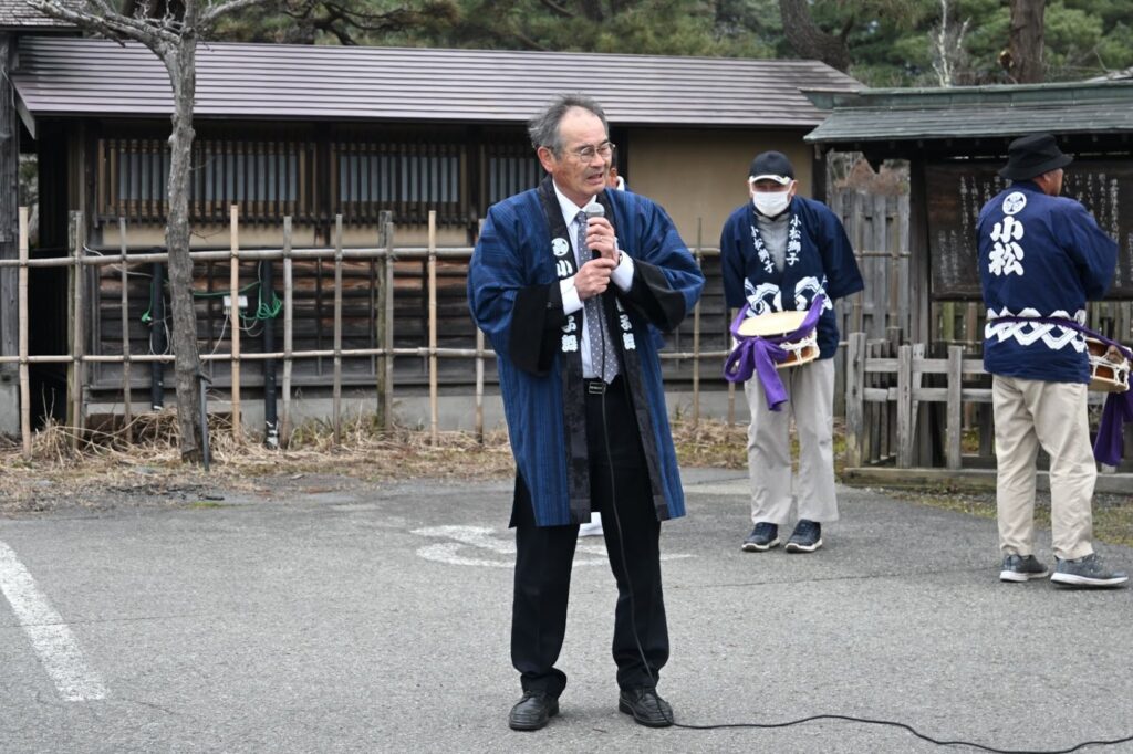 あいさつをする小松獅子保存会代表(福島県会津若松市、2026年3月21日、筆者撮影)