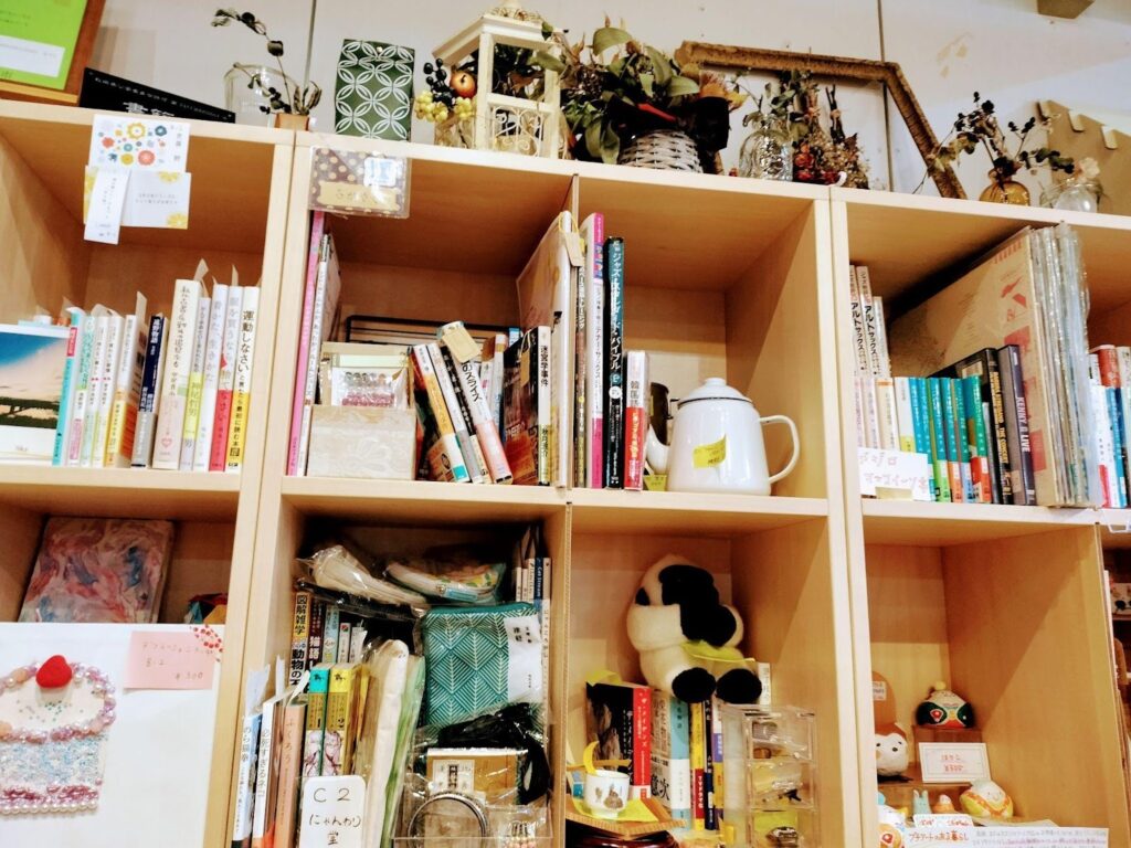 「家、とか学校、とか母親、とか職場、とかの役割を一回外す場所を作りたいと思いました。私自身、家族の介護を経験しましたが、普段頑張りすぎている人たちが、自分に戻れる場所がきっと必要だろうと思っていたところに、シェア型書店の存在を知りました。本だけに限らず、コミュニティースペースを作りたかったので、ハンドメイドの小物など、その方の思いやストーリー、「好き」を感じるものを置いてもらって、人とつながることが出来る場所でありたいと思っています。ここに来ると、なにかしら興味のアンテナに触れるものがきっとありますよ(笑)」。