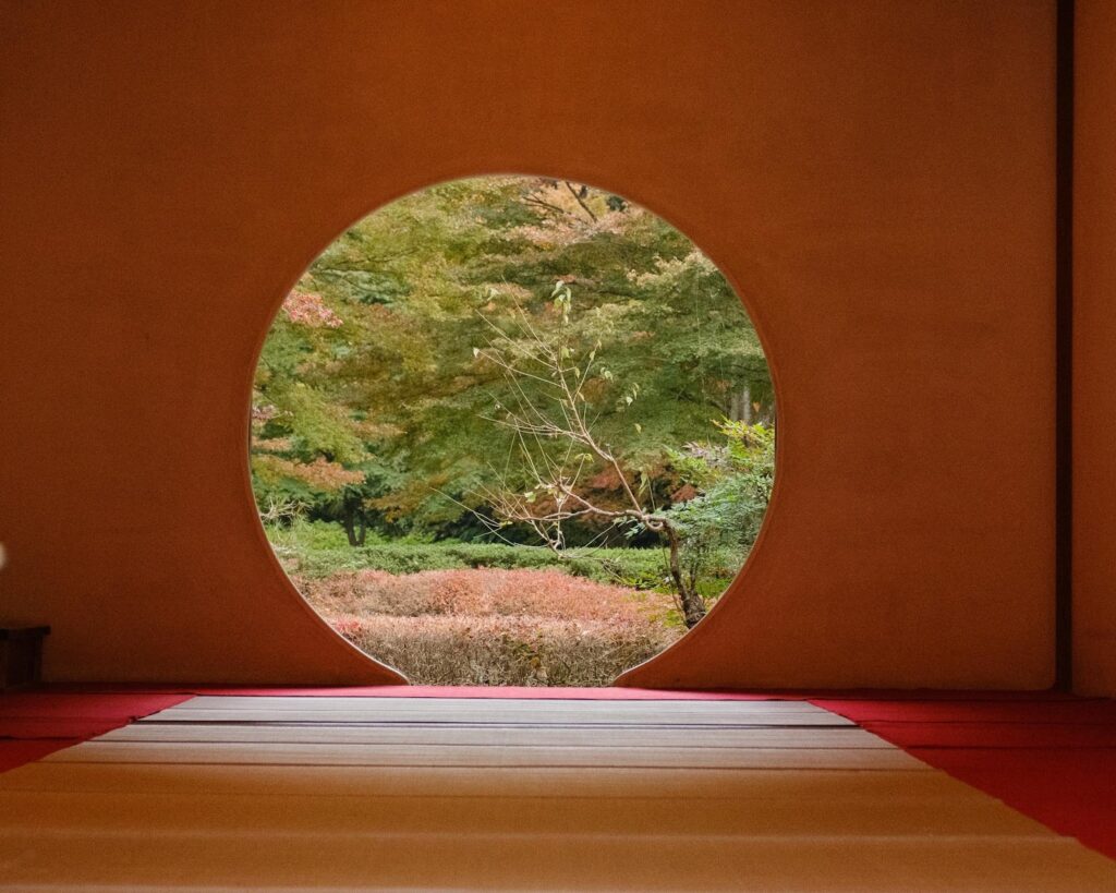 その円窓は、ひとつの“額縁”のように風景を切り取る。季節、天気、時間によって庭の色も光も変わり、同じ場所でもまったく異なる表情を見せる。紅葉の時期の円窓の景色は、とりわけ印象深い。赤や黄に染まった葉が、柔らかな光に照らされ、まるで計算された日本画の一枚がそこに置かれているかのようだった。