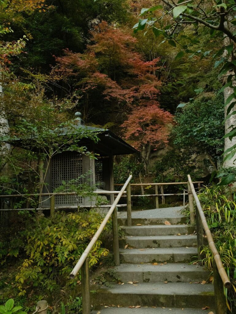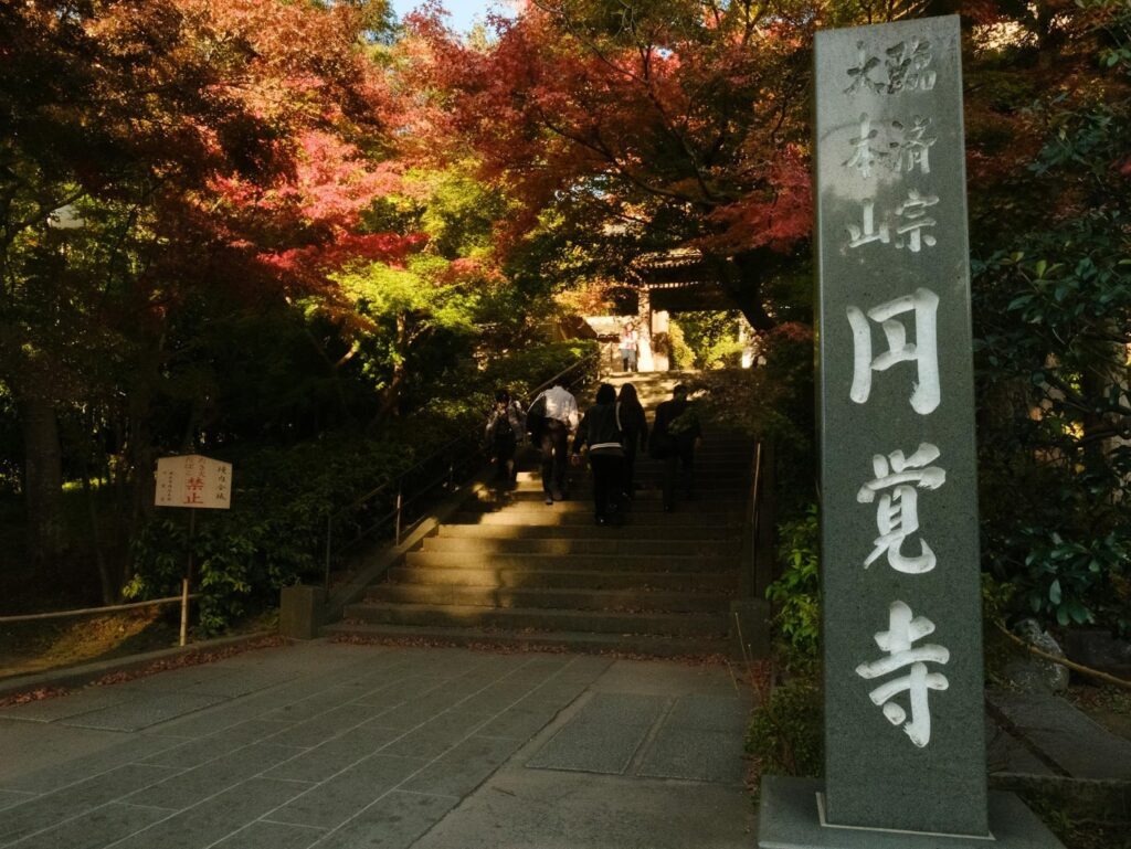 最初に訪れたのは円覚寺だった。JR北鎌倉駅を出て踏切を渡ると、境内へ続く石段がすぐ眼前に現れる。11月中旬の訪問では、階段の両側が紅葉に染まり、赤や黄色の葉が頭上を覆い、鮮やかなアーチの中を進むような感覚だった。