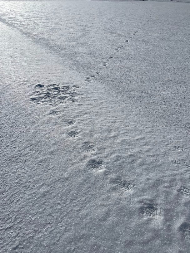 途中で立ち止まり、くるくると何かを探したような動物の足跡も