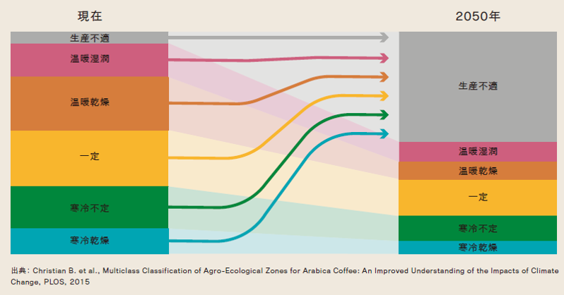 気候変動によるコーヒー生産の危機、「コーヒーの2050年問題」です。 気候変動は、コーヒーの生産環境そのものを揺るがしています。 世界で最も多く飲まれているアラビカ種は、寒暖差のある高地など限られた環境でしか育たず、平均気温の上昇や降雨パターンの変化によって、将来アラビカ種の栽培適地が大幅に減少すると予測されています。