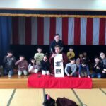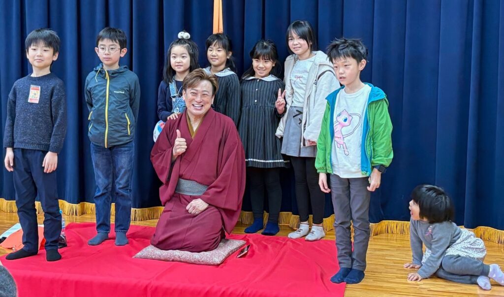 演目以外にも手ぬぐいと扇子を用いたクイズを行うなど実際に落語を子どもたちに体験させていた。