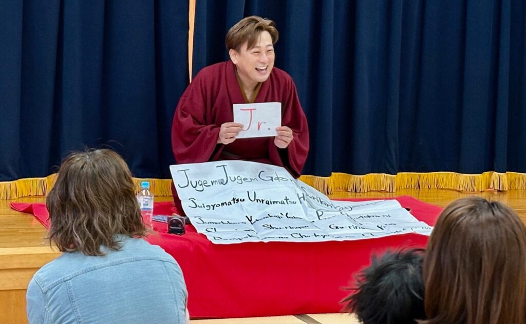 「寿限無」といえば、生まれた子がいつまでも元気で長生きできるようにと考えて、とにかく「長い」物が良いという理由でとてつもなく長い名前を付けた笑い話で、上方落語では別名「長名の倅(せがれ)」と呼ばれる有名な前座噺(ぜんざばなし)である。これを喜餅さんが英語で子どもたちにもわかりやすく話した。