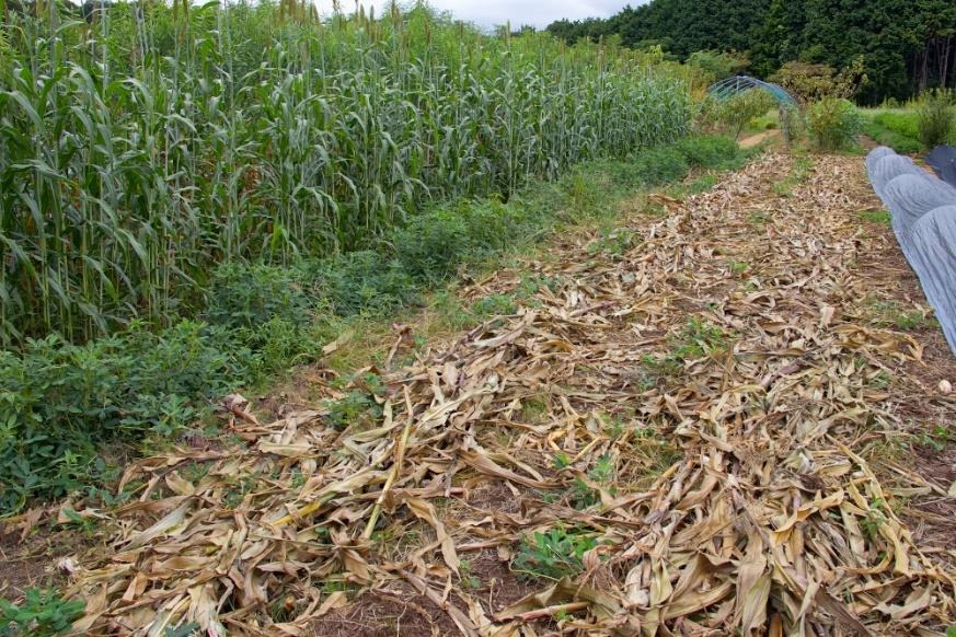 畑を耕さずに土を良くする工夫の一つは、土壌改良のために育てた植物(緑肥・りょくひ)を表層に残し、土が裸にならない状態をつくること。有機物が分解され肥料となるだけでなく、保水性が改善されたり、虫や微生物の住み家になるなどの効果があります。