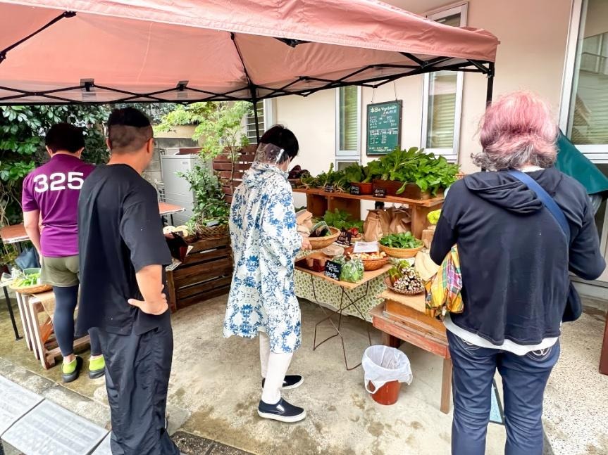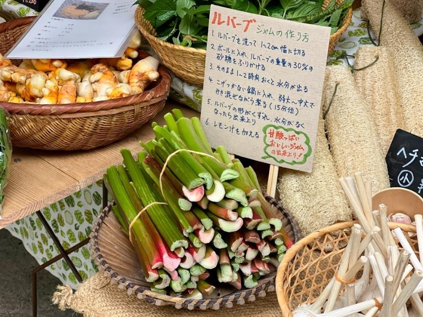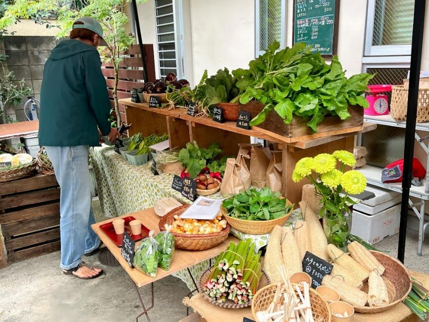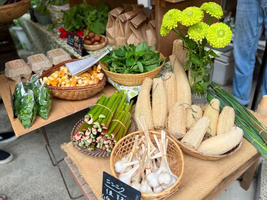 CSAでの農産物販売以外にも、毎週土曜日には東京都荒川区にあるゆかしさんのご実家で農産物の屋外販売をしています。その名は「町屋マルシェ」。日よけの下にたくさんの種類の野菜がきれいに並べられ、手書きの商品説明が付けられていました。元気な野菜が並ぶ姿はPhotogenic!
