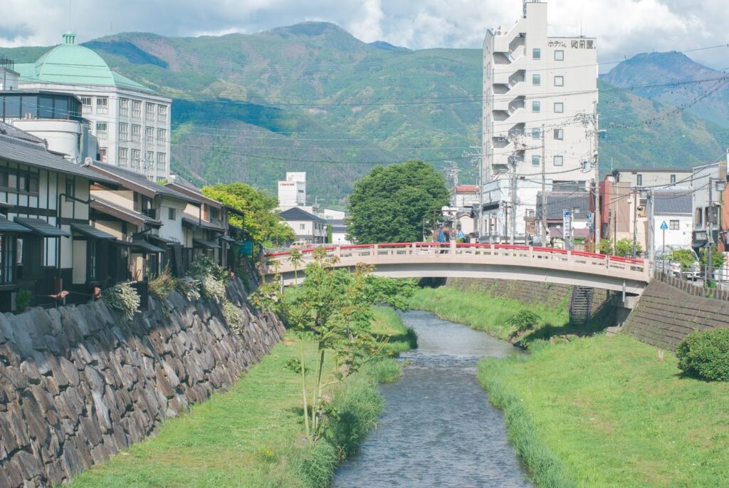 女鳥羽川をはさんで、南に中町通り、北に縄手通りという観光客で賑わう通りがあります。山がすぐ近くに見えますね。その先には美ヶ原高原があり、温泉地もたくさんあります。今回は松本駅近くのホテルに泊まりましたが、温泉にゆっくり泊まるのもいいですね。