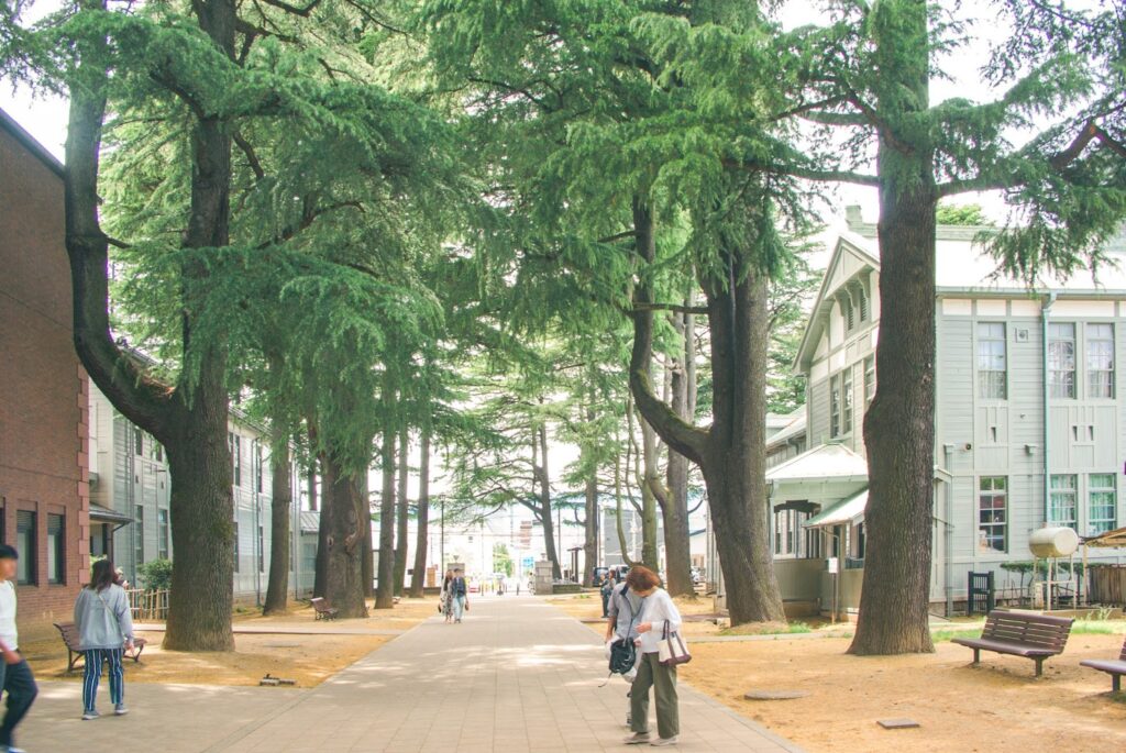 さらに歩いていくと、「あがたの森公園」に到着! 旧制松本高等学校の敷地は現在「あがたの森公園」となっていて、市民の憩いの場です。