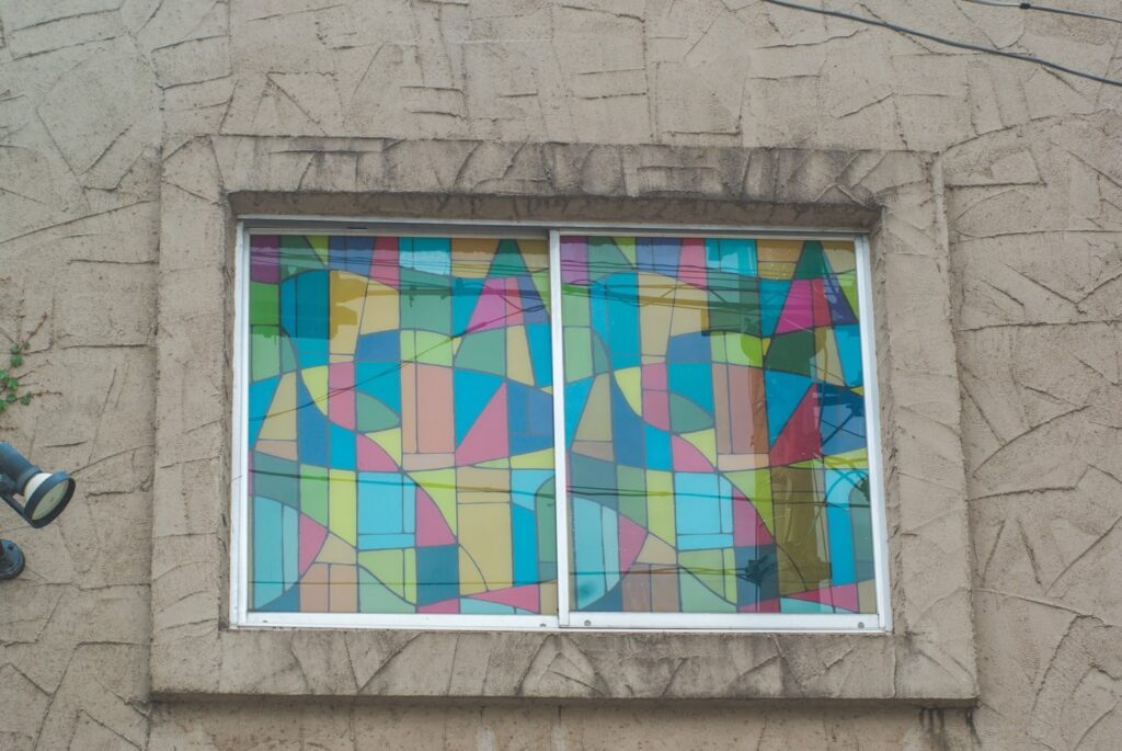懐かしいステンドグラス風のシートを貼った窓。