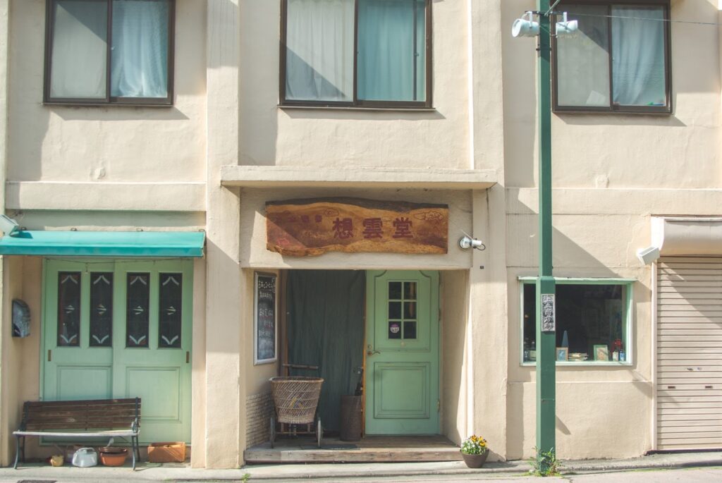 ホテル花月の向かいにあった「想雲堂」というお店は、ドアがキュートだったので撮りました。たくさんの蔵書がある有名な古本喫茶だそうです。大正時代の店舗建築をリフォームしたとのことです。
