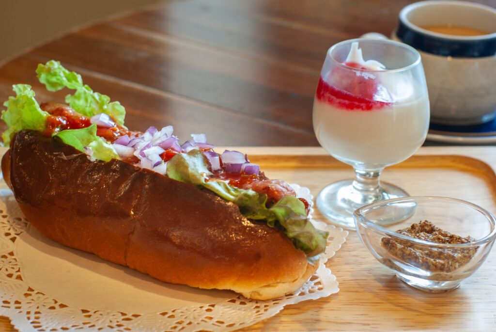ランチタイムはもう終わってしまったので、ホットドッグを注文しました。ホテル特製のソーセージがもう絶品! かかっているソースも紫玉ネギがアクセントになっていて、大変美味。ヨーグルトも付いてきましたが、これにかかっていたラズベリーソースが、さすがのホテルメイドで本当においしかったです。ちょっと感動するほど。