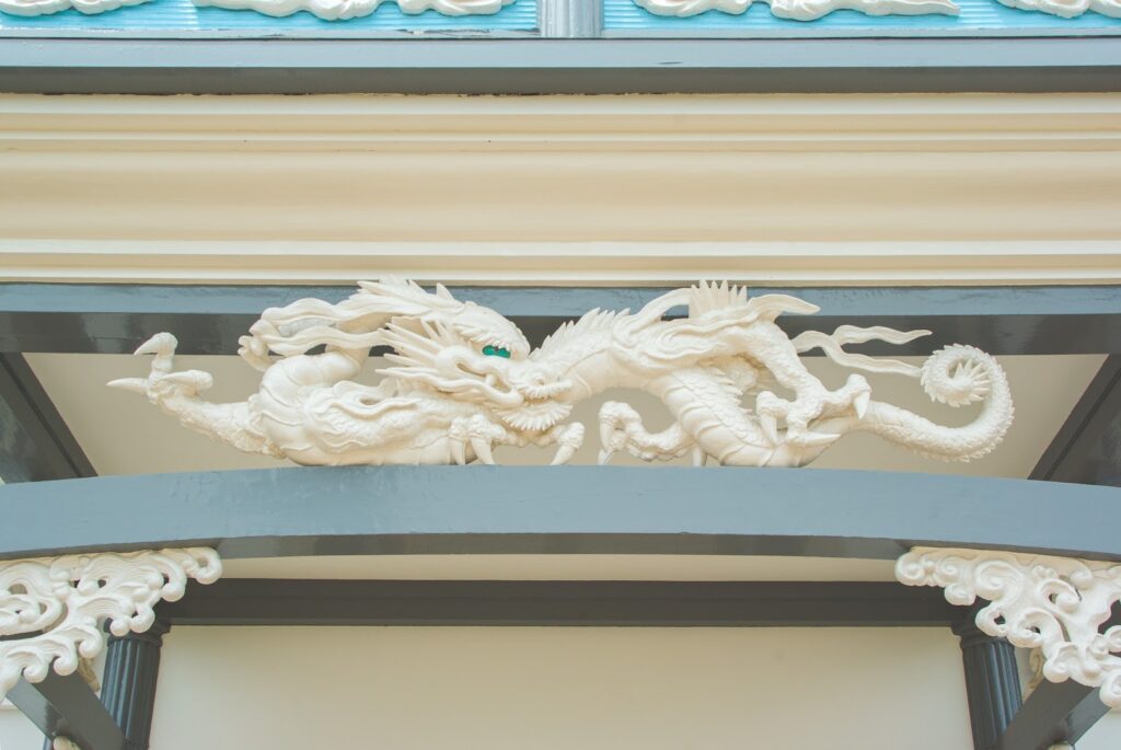 車寄せにはこのような龍の彫刻も。開智学校校舎の設計施工は、地元松本出身の大工棟梁・立石清重です。建設費の7割は地元住民が出し合ったお金だそうで、新しい時代を作ろうとする住民の熱意が感じられます。