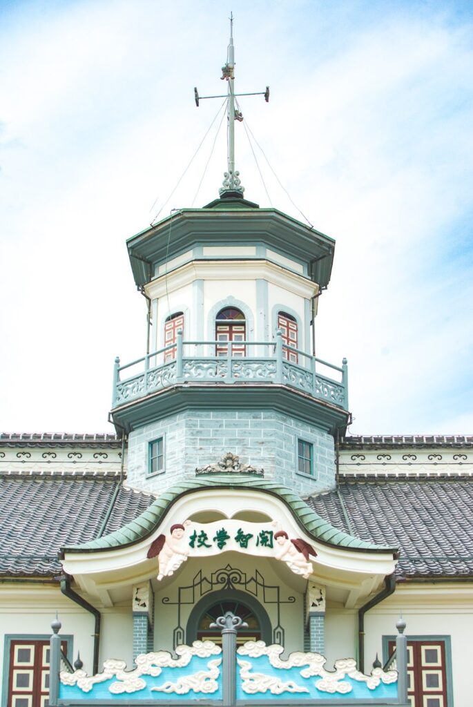 開智学校は和洋折衷の「擬洋風建築」で、文明開化期の特徴をよく表しています。八角塔の下にある車寄せの天使像や色鮮やかな雲のモチーフが、無国籍な雰囲気でユニークですね。