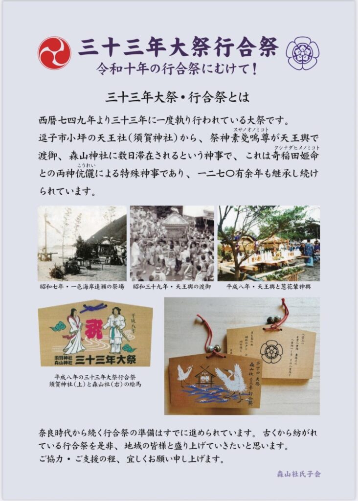 神奈川県葉山町一色。御用邸の静寂に包まれたこの町で、1200年以上もの間、守り抜かれてきた場所がある。森山神社。ここに祭られているのは、たおやかな女性の神様「奇稲田姫命(くしいなだひめのみこと)」だ。夫である「素戔嗚尊(すさのおのみこと)」は逗子市小坪の神社に祭られており、二人の神様が再会できるのは33年に一度の「三十三年大祭(行合祭り)」のみ。奈良時代から続く、壮大な時間の流れがここには息づいている。