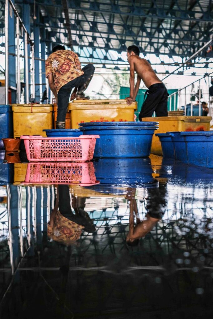 ムアラ・アンケ魚市場を歩いていて印象的なのが、魚を処理するための器やバケツのカラフルさである。