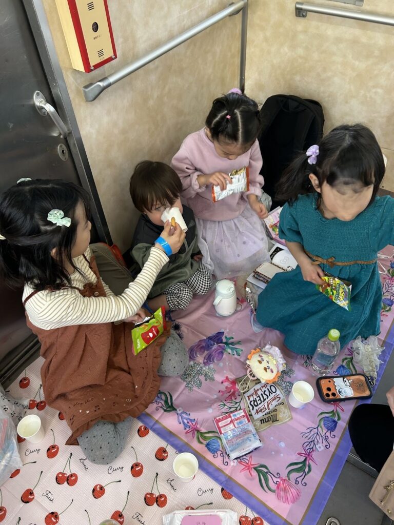 電車内にレジャーシートを敷き、子どもたちはピクニックのようにくつろぎながら過ごしている。大人はビール、子どもはジュースやおやつを手に、それぞれの時間を楽しむ。普段はできない、このイベントならではの光景だ。