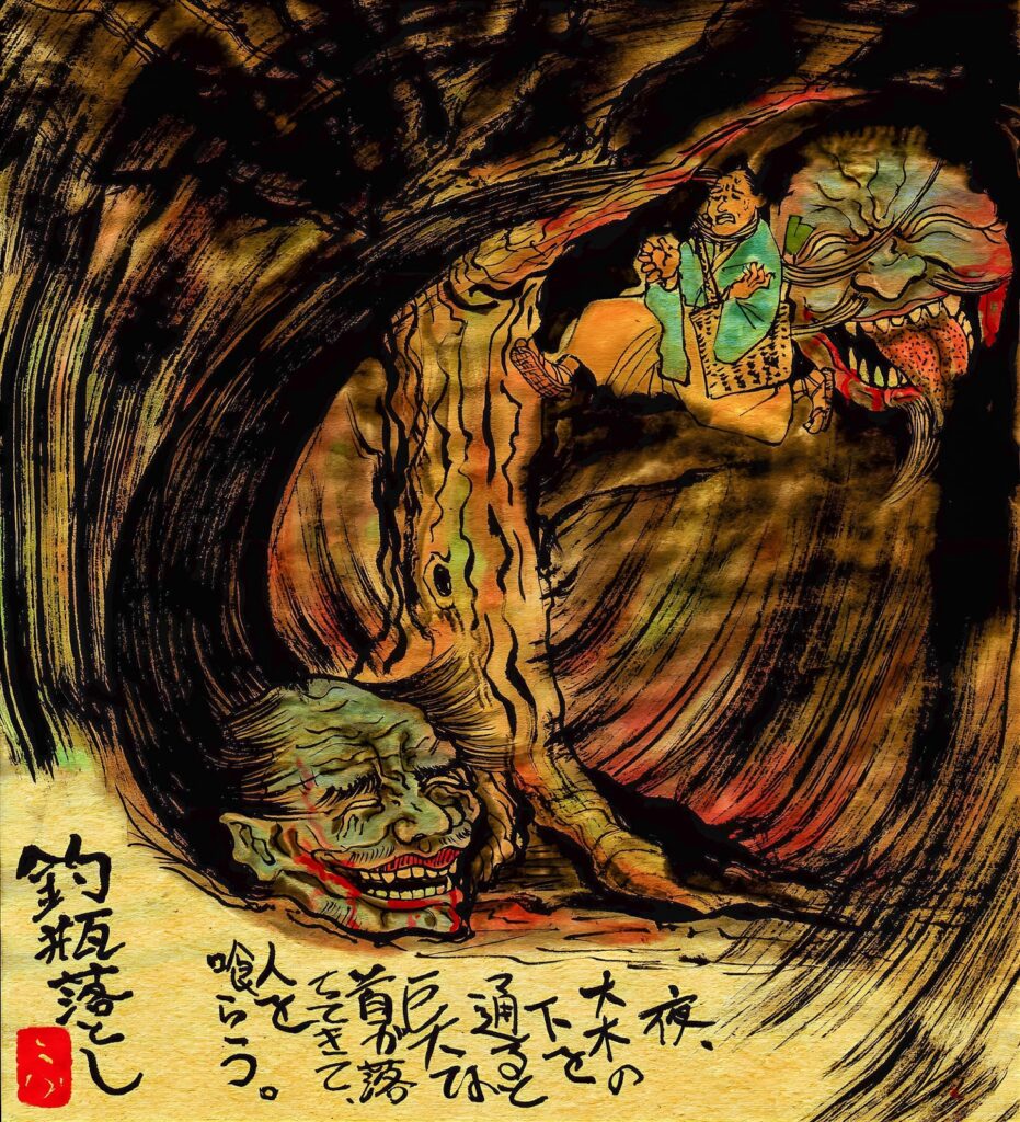 実は筆者は前述のイベントで市内を回りながら取材をした際に知ったのですが、丹波篠山市にも「坪井の榧の木」という昔話のなかで、馬の首ではなく人の生首を落とす妖怪が伝わっています。どちらも木から生首を落とすという部分は共通しています。「つるべ落とし」という名の妖怪は各地に伝わっており、こうした話も、その語源の一端を示すものと考えられます。