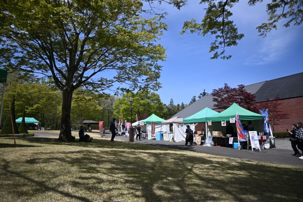本展は「四季の里 桜まつり 2026」の関連企画として実施され、市民団体「WABUNKAふくしま」が主催するお茶会と同会場で開かれた。会場にはキッチンカーや物産販売、ワークショップを楽しむ来場者が行き交い、その一角に設けられた展示スペースにも多くの人が足を運んだ。