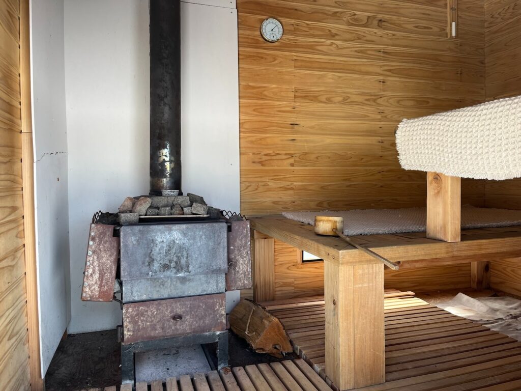 中を見せてもらうと、そこには一台の薪(まき)ストーブ。その上には「サウナストーン」と呼ばれる石が積まれていました。薪で石を熱し、その熱した石に水をかけて蒸気を発生させ、室内の湿度と体感温度を一気に上げます。
