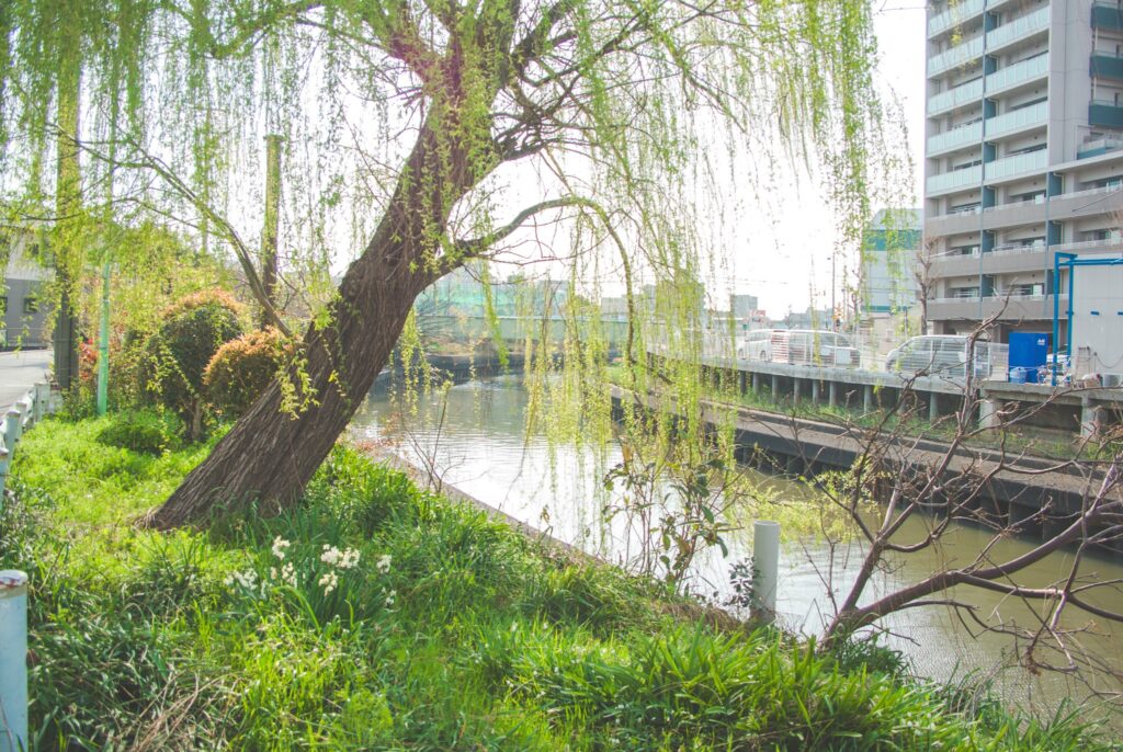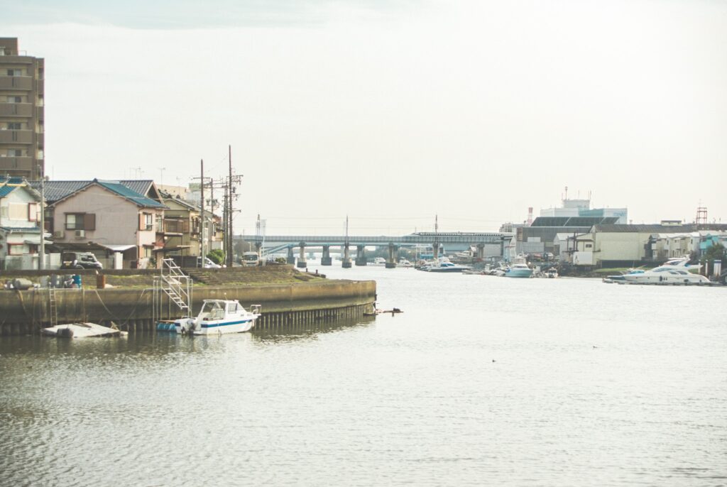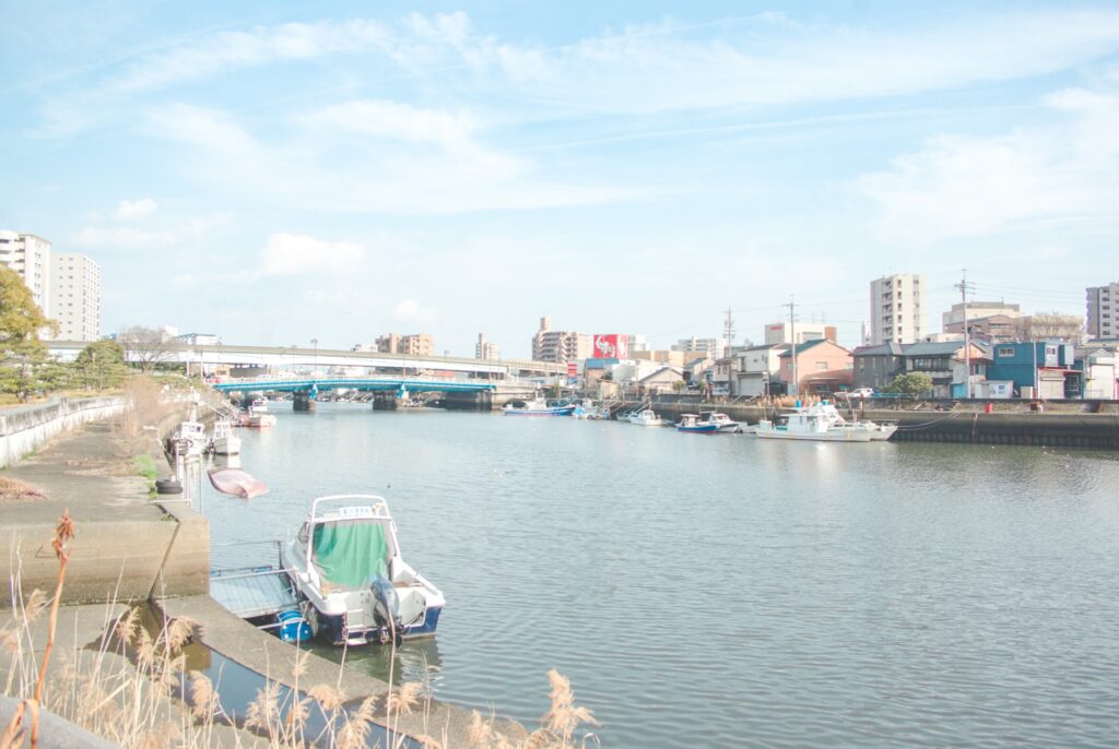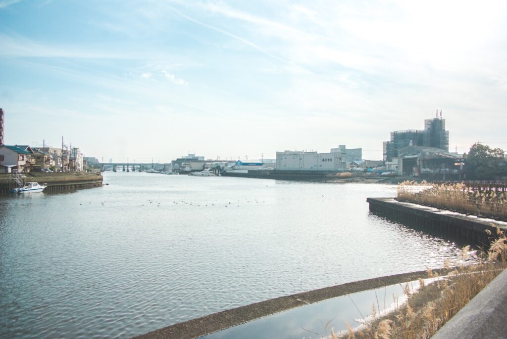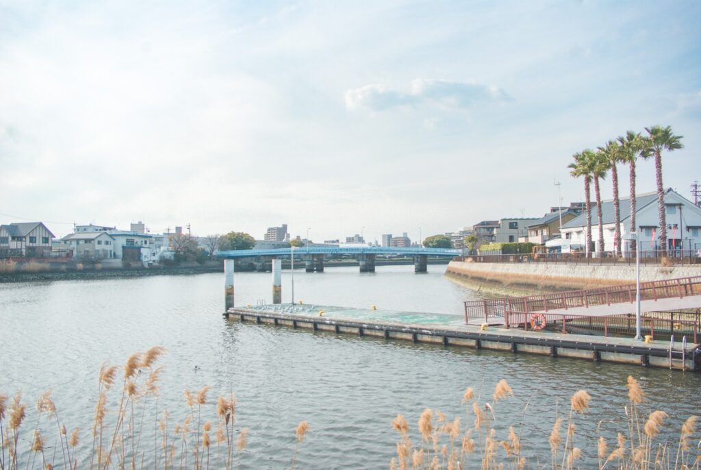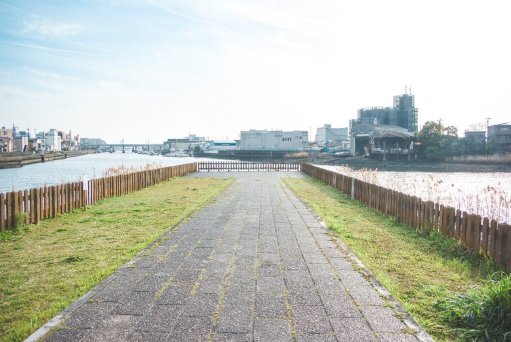 ここが船着場跡です。かつてここから多くの人が舟に乗って行ったのですね。現在は海ではありませんが、この先に名古屋港があるので海の空気が感じられます。水辺の開放感のある空間はとてもリラックスできますよ。