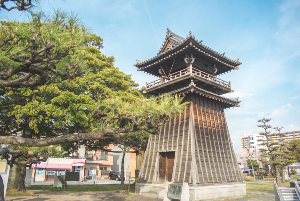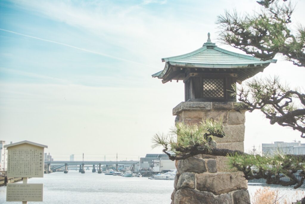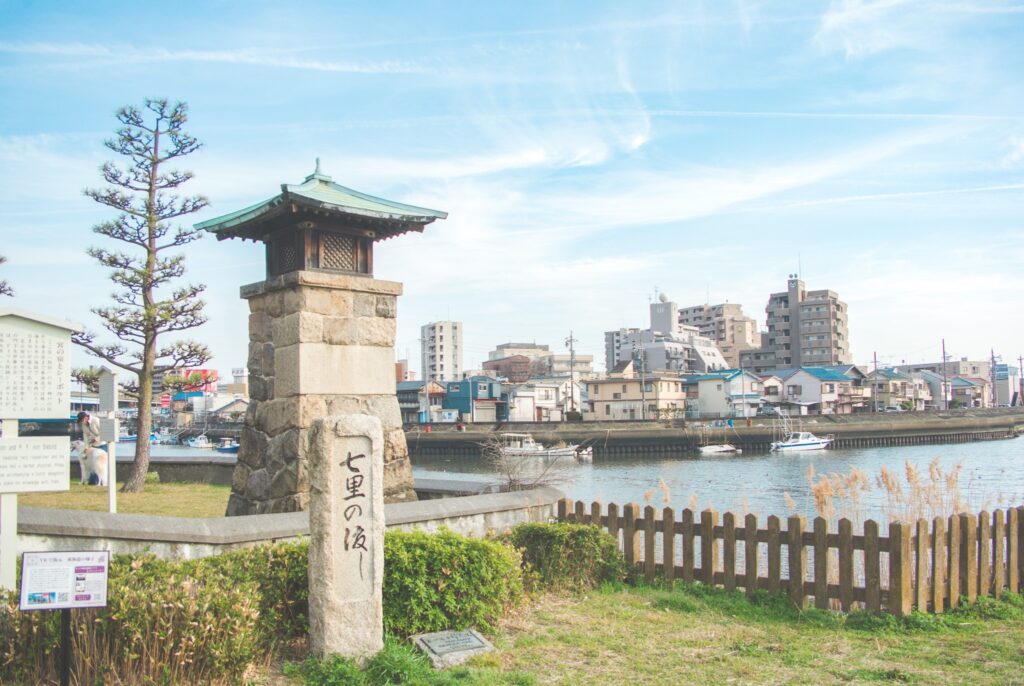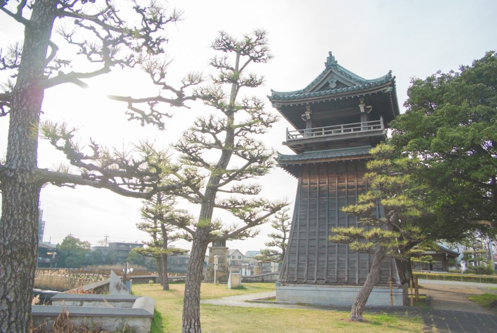 常夜灯や鐘楼(しょうろう)が復元され、水辺の風景を眺めながら歴史を感じられる場所となっています。