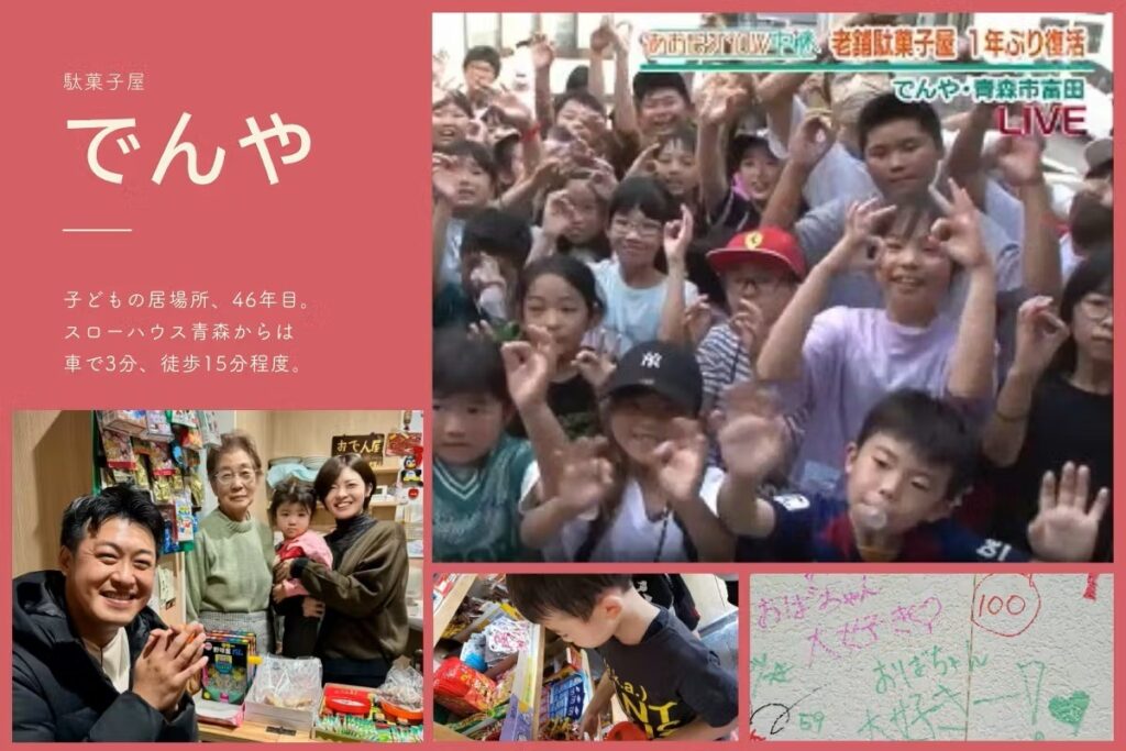 SLOW HOUSE @aomoriは、宿泊施設であると同時に、子どもの居場所としての役割も目指している。実は、椎乃さんの実家近くには祖母が営む駄菓子屋「でんや」がある。