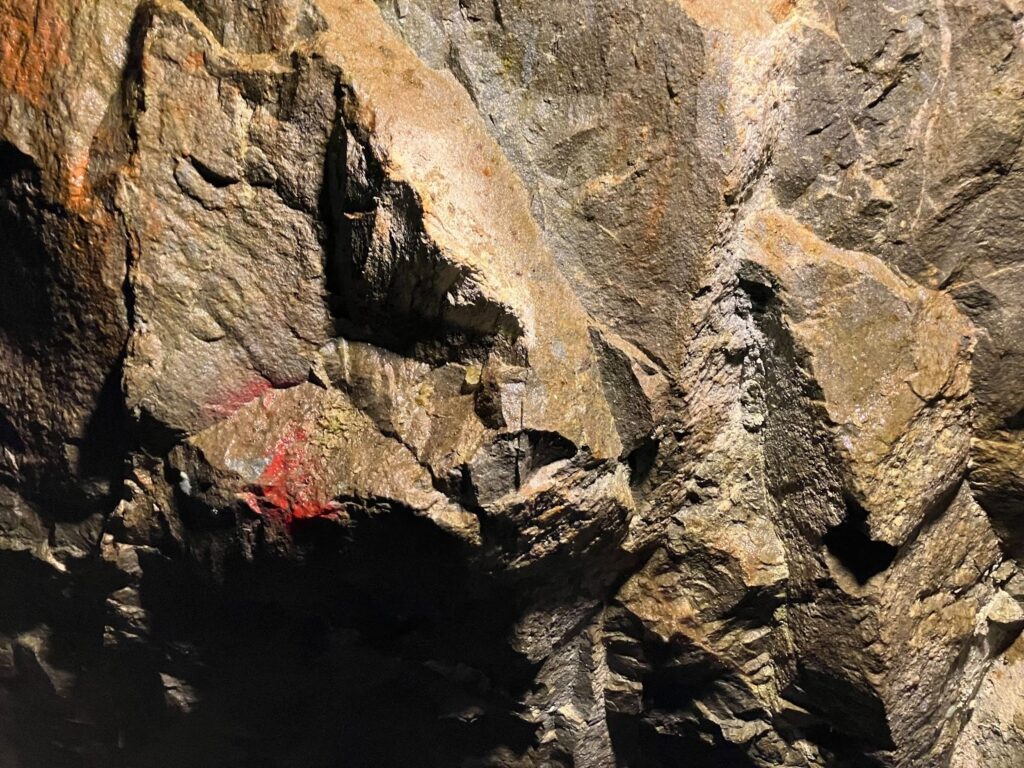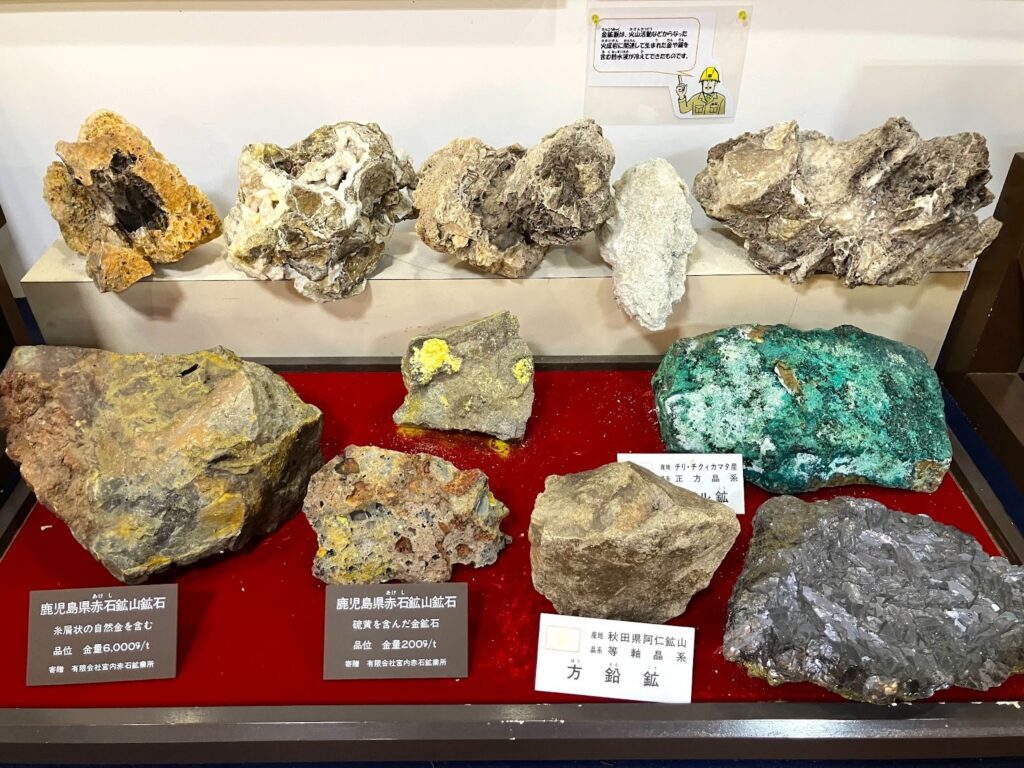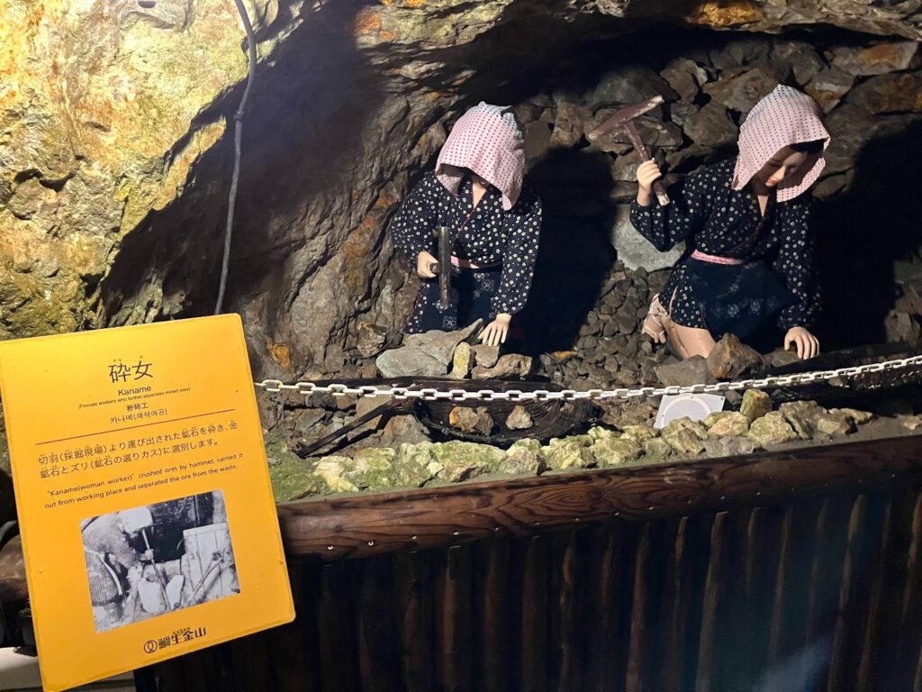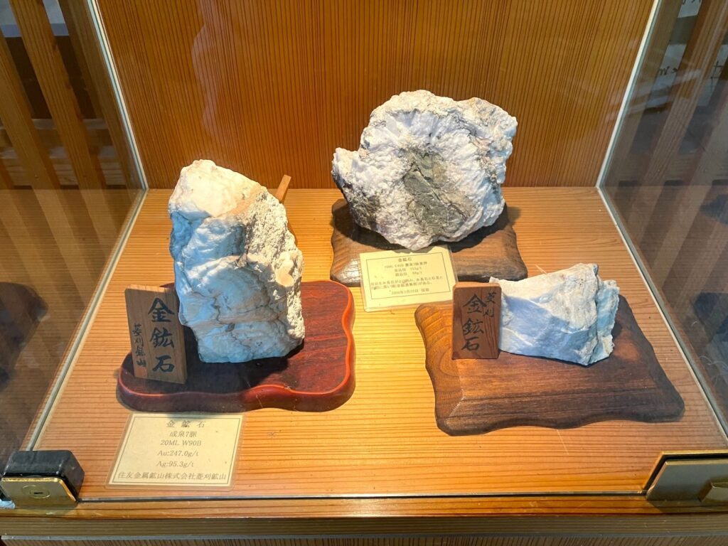 当時の受付を再現した人形にあいさつして、先に進みます。早速むき出しの「金銀鉱脈」がありました。他にも鉱石がそのままの状態で見られます。