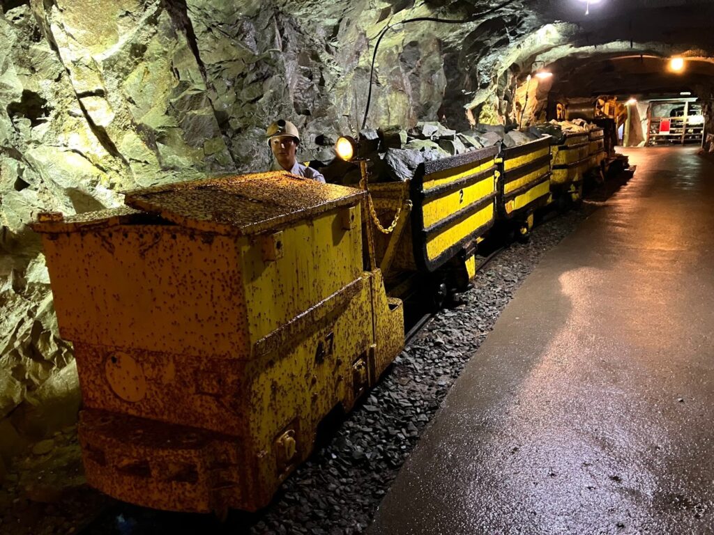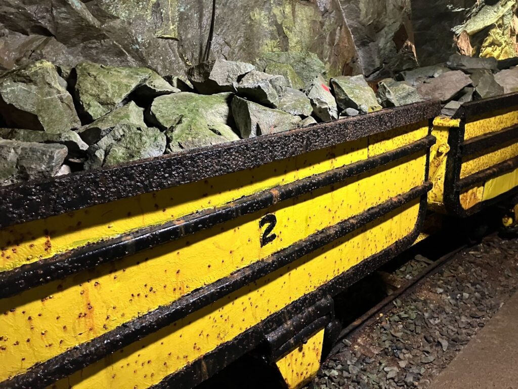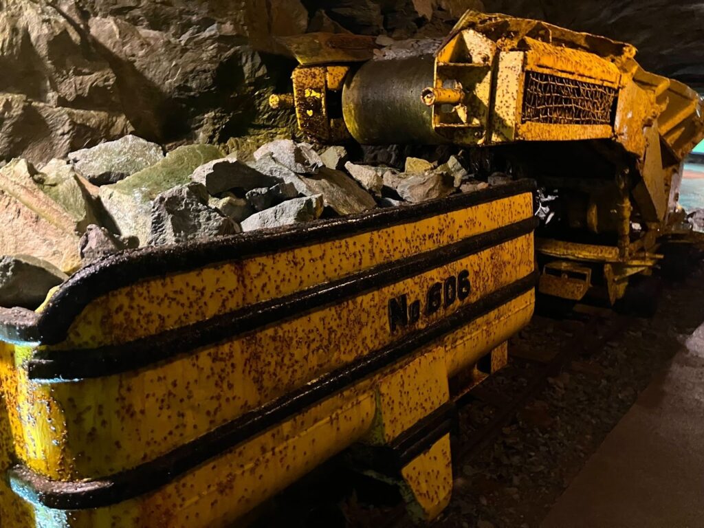 水平坑道での金鉱石の運搬には、このバッテリー機関車と鉱車が大活躍。ロッカーショベルカーも採掘された鉱石をすくいあげて、鉱車へ載せます。