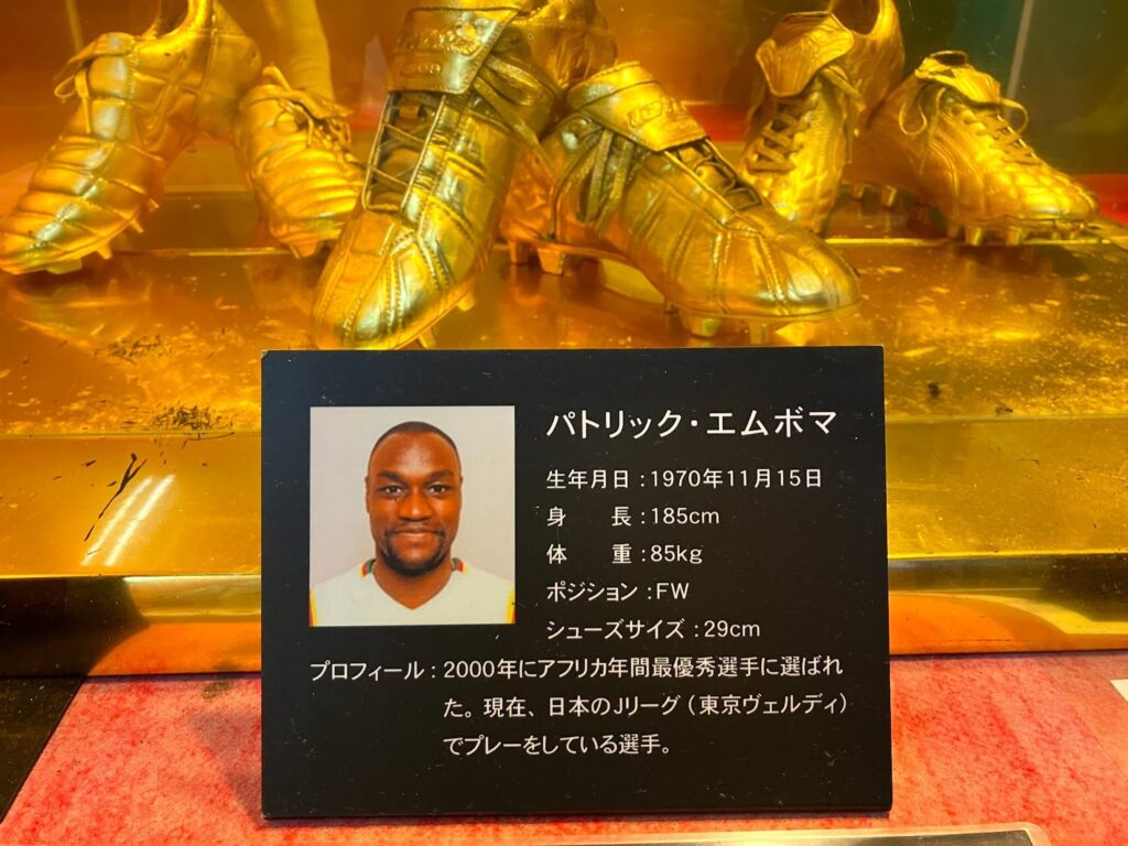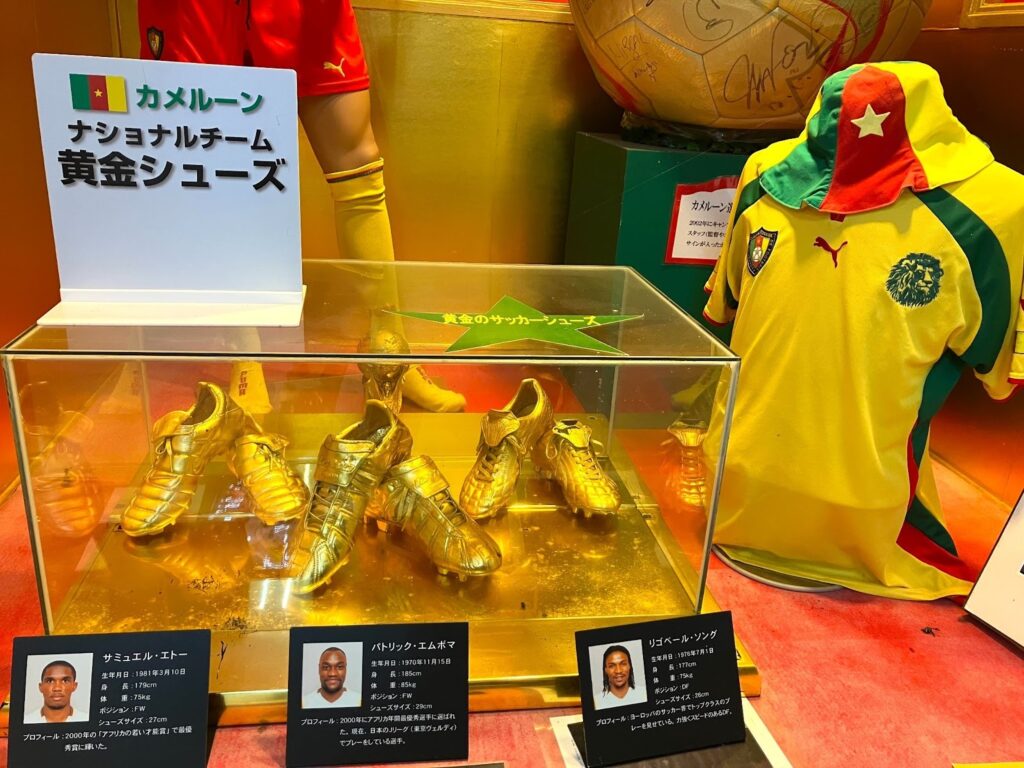 2002年当時のカメルーン代表選手の黄金シューズも展示されていました。「サミュエル・エトー」「パトリック・エムボマ」「リゴベール・ソング」の3選手のシューズです。
