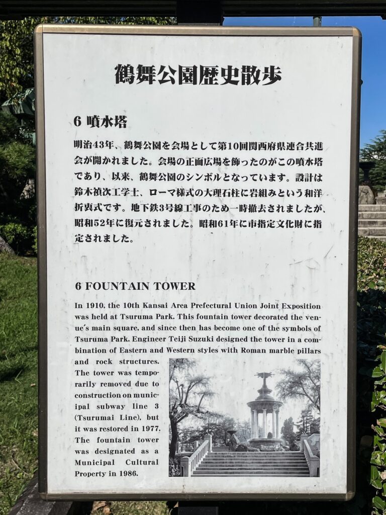 1910(明治43)年の第10回関西府県連合共進会での正面広場を飾ったのがこの噴水塔で、以来鶴舞公園のシンボルとなっています。