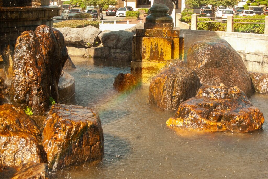 撮影日はとてもいいお天気だったので、噴水の水が岩に落ちるところで虹が出ていました。