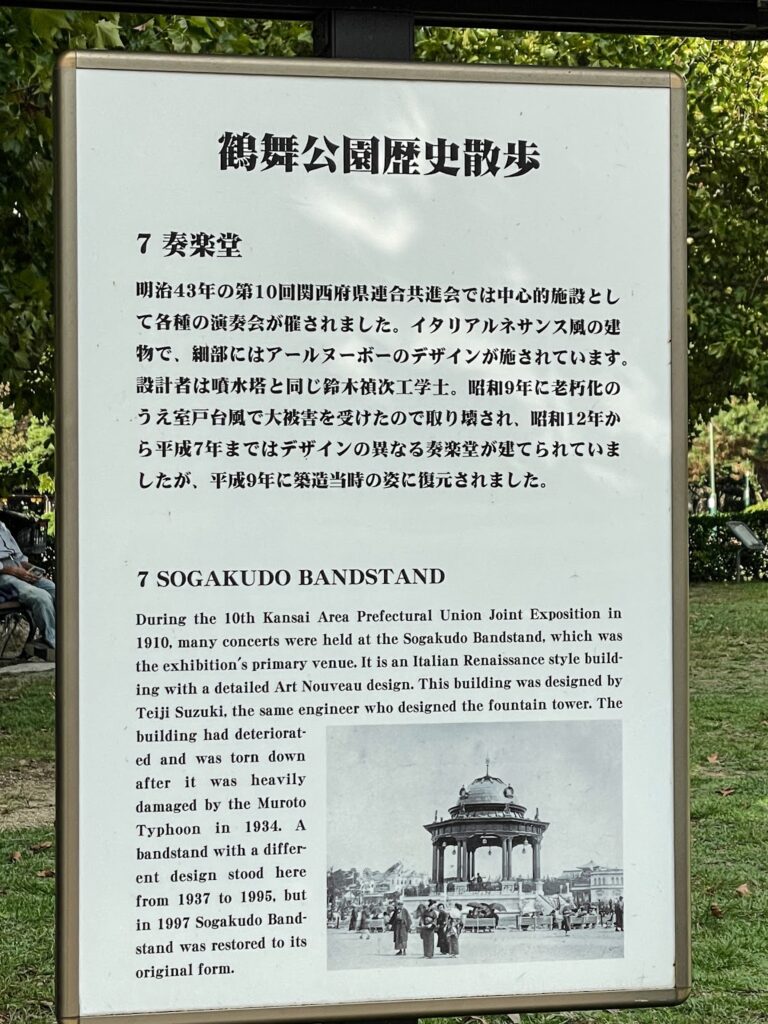 噴水塔からさらに並木道を進んでいくと、独特な形状の「奏楽堂」が現れます。1910(明治43)年の第10回関西府県連合共進会の中心的施設として建造されました。イタリアルネサンス風の円形舞台の建物ですが、細部にアール・ヌーボー風のデザインが施されています。