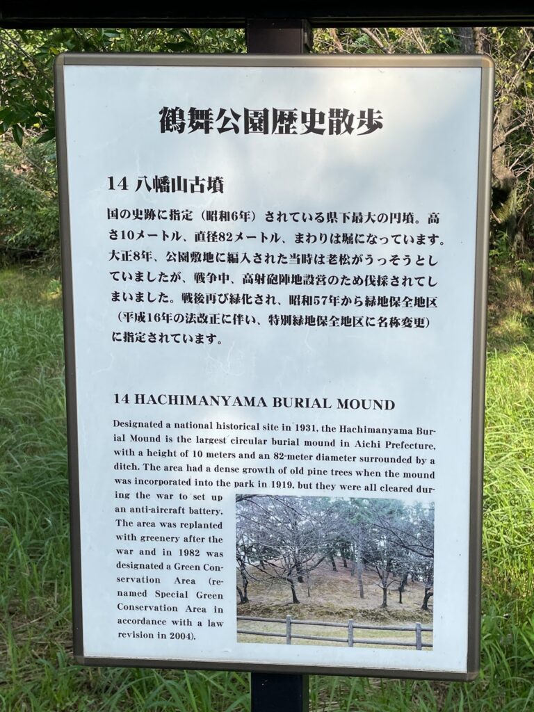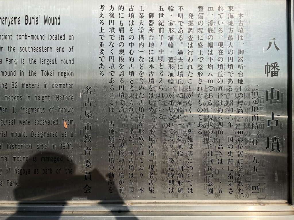 名古屋市のサイトによると、5世紀前半に名古屋台地を支配した豪族の墳墓とみられ、出土した埴輪(はにわ)などは戦災で失われたそうです。八幡山の名は、御器所八幡宮の奥宮があったからで、いろいろ神事がおこなわれたとも伝わっているそうです。