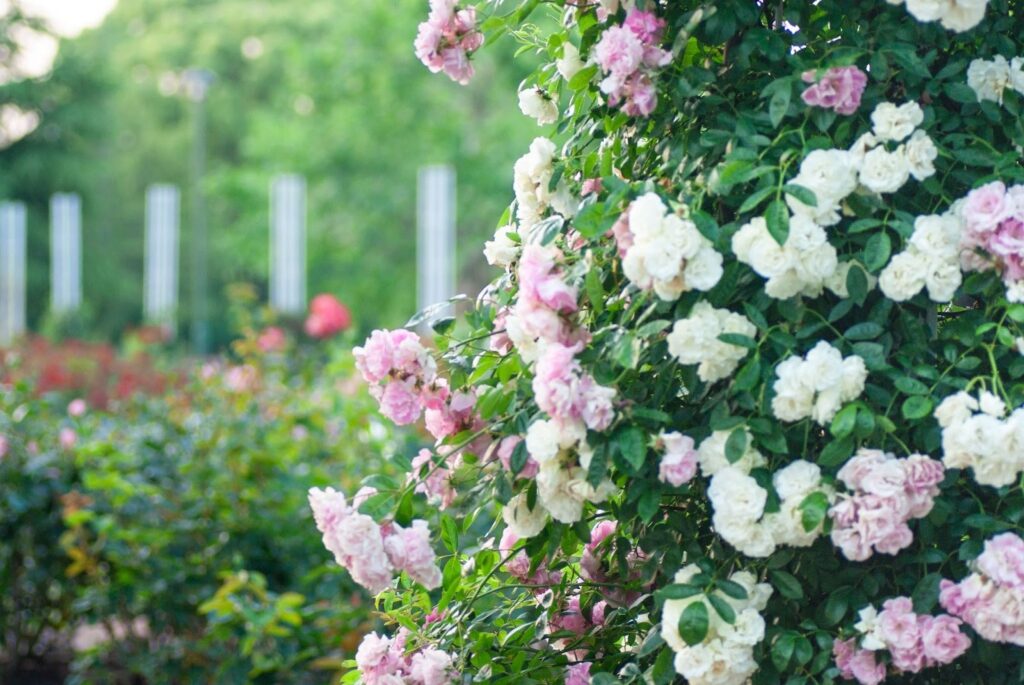 では、今度は園内に咲き乱れるお花を見てみましょう! 噴水塔と奏楽堂の間には大きなバラ園があり、シーズンにはたくさんの人が訪れます。取材時はまだちょっとバラの見頃には早かったのですが、一部咲いていました。