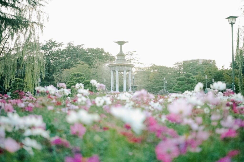 鶴舞公園は明治時代にできた公園ですので、園内には明治時代から各時代の歴史的な様式の建造物が点在しています。私はレトロ建築が好きであちこちの古い建物を巡って撮影するのが趣味なのですが、鶴舞公園は絵になる風景が多く、花があふれているので絶好の撮影スポットです。