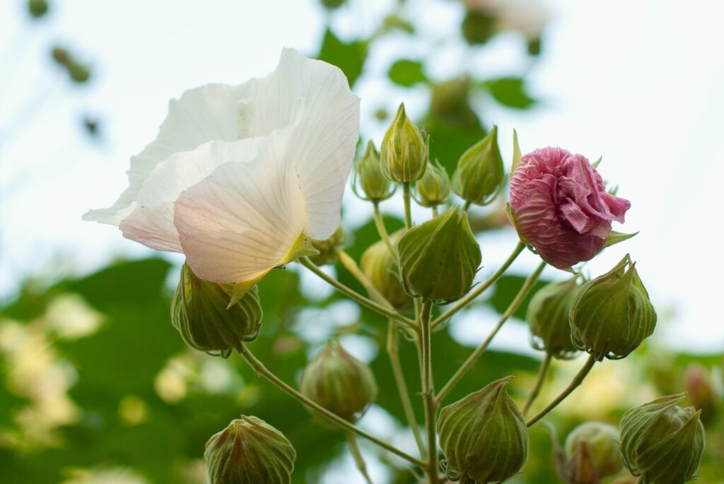 緑化センターの周りにはたくさんのお花が咲いていました。緑化センターはこのスイフヨウ(酔芙蓉)で有名だそうです。スイフヨウは朝に白色で咲いた花が、夕方にかけて徐々にピンク色に変化していくのが特徴だそうです。白とピンクの2色で綺麗ですね。