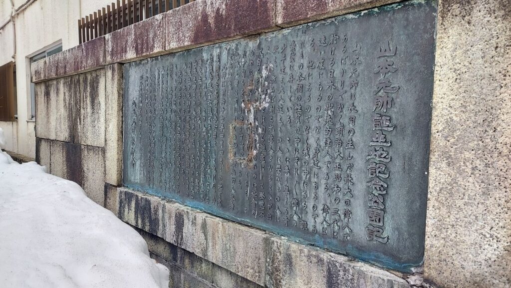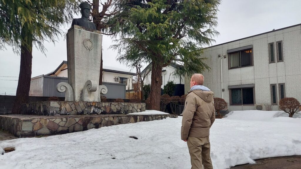 記念館を出たあと、私たちは歩いて数分の場所にある山本五十六の生家跡にも立ち寄った。現在は石碑が建つだけの静かな場所だが、ここが1884年、山本が生まれた場所である。雪の残る庭先に立つと、展示室で見た資料の人物が、急に長岡の町と結びついて見えてきた。彼も石碑の前でしばらく足を止め、静かに周囲を見回していた。